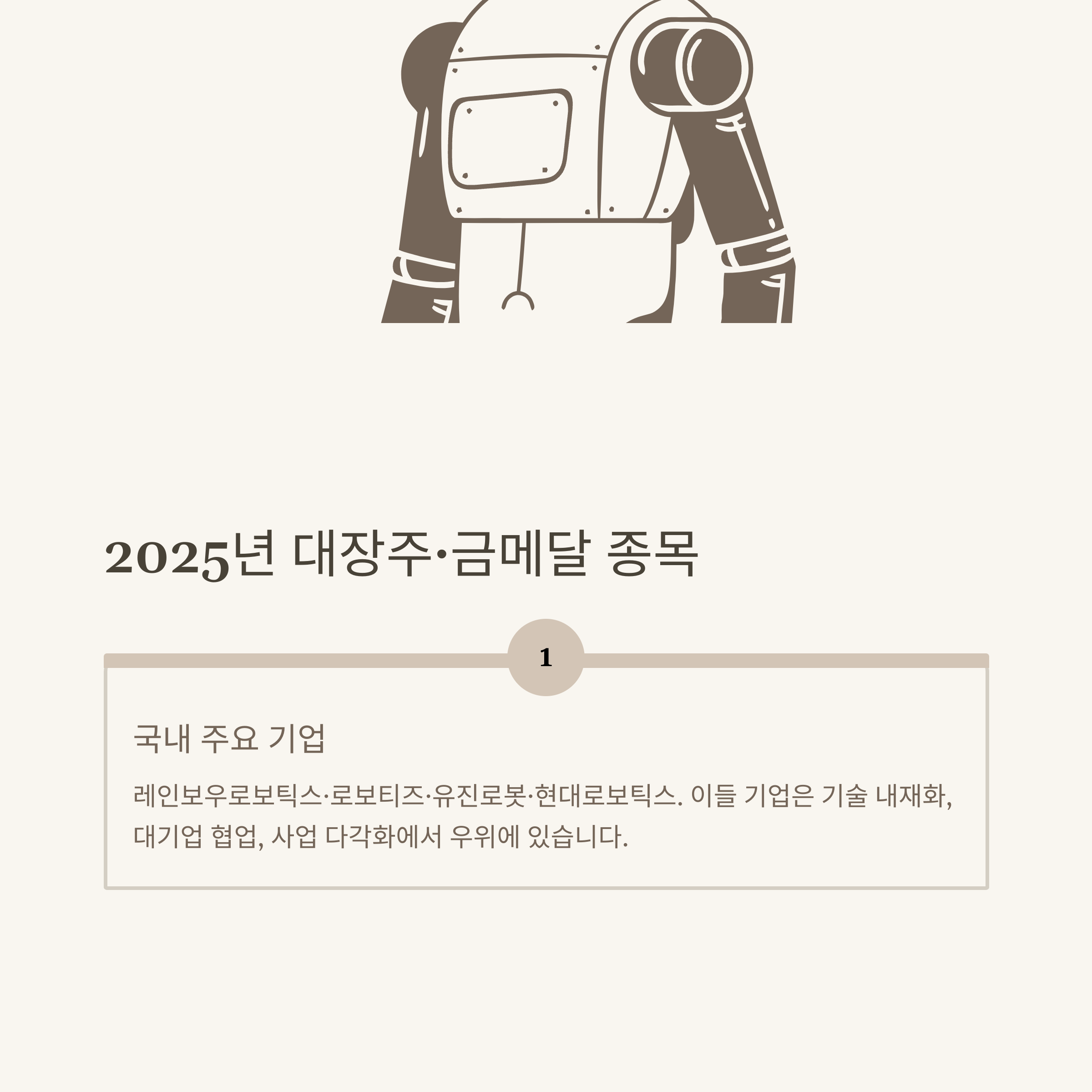 금메달 종목으로 꼽히는 레인보우로보틱스는 삼성, LG, 네이버, 현대 등 국내외 대기업과 협업을 늘려가고 있고, 로보티즈는 소프트웨어와 하드웨어를 동시에 자체 개발한다는 점이 강점입니다. 유진로봇은 물류·서비스·청소로봇까지 사업을 확장 중이며, 현대로보틱스는 기존 산업용 로봇 강점을 바탕으로 협동로봇 시장 점유율을 꾸준히 늘려가고 있습니다.