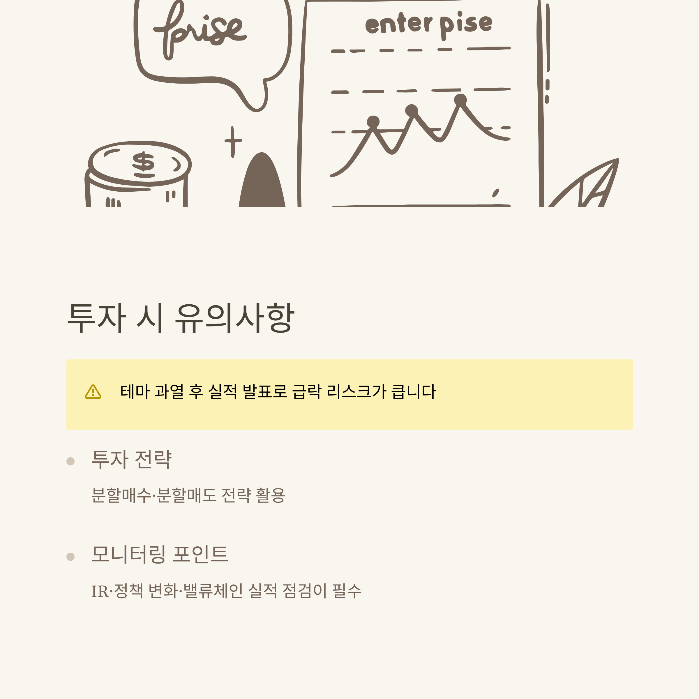 - 테마 급등 후 급락(재료 소멸, 실적 실망) 주의