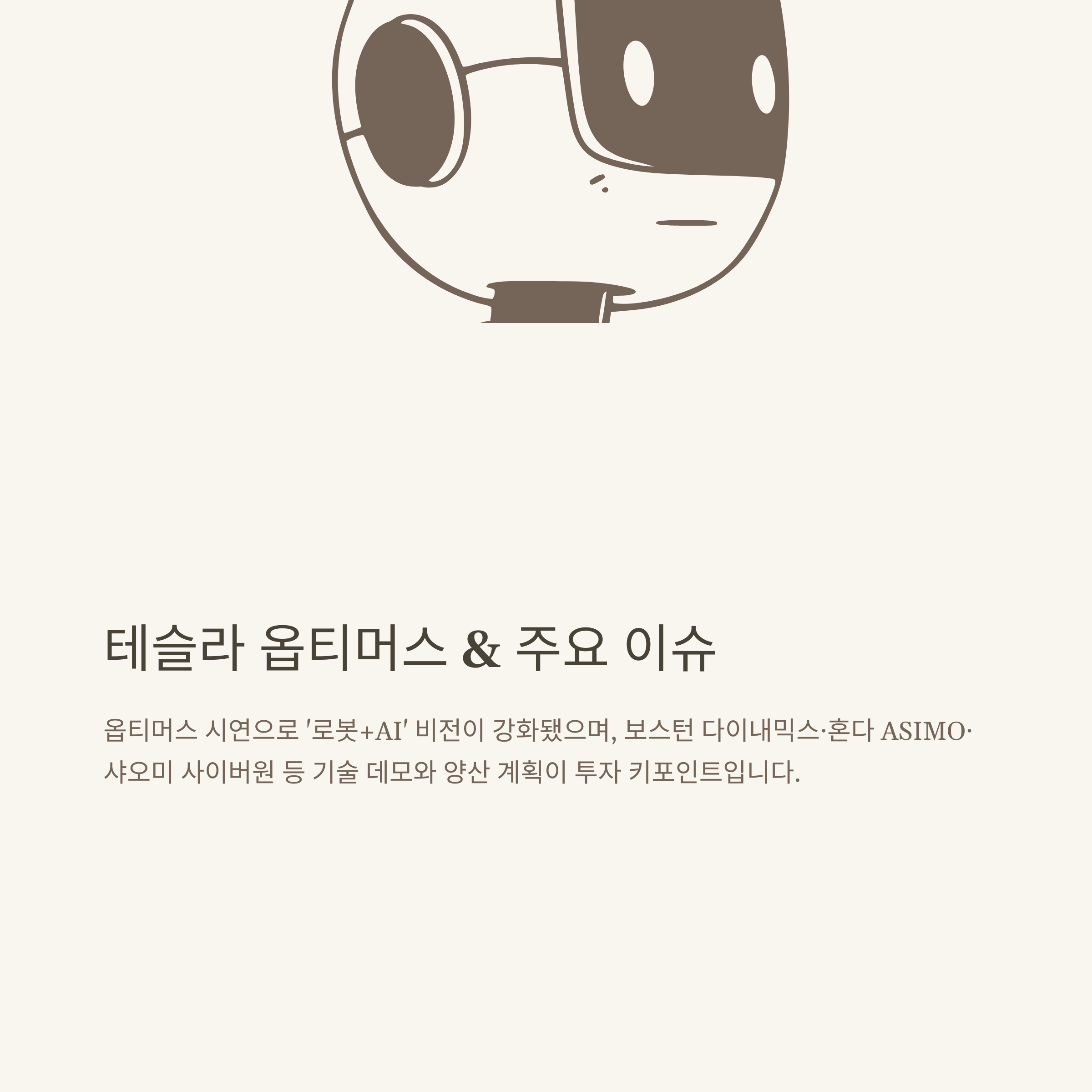 - 테슬라 옵티머스: AI+로봇 결합, 산업 자동화 상징