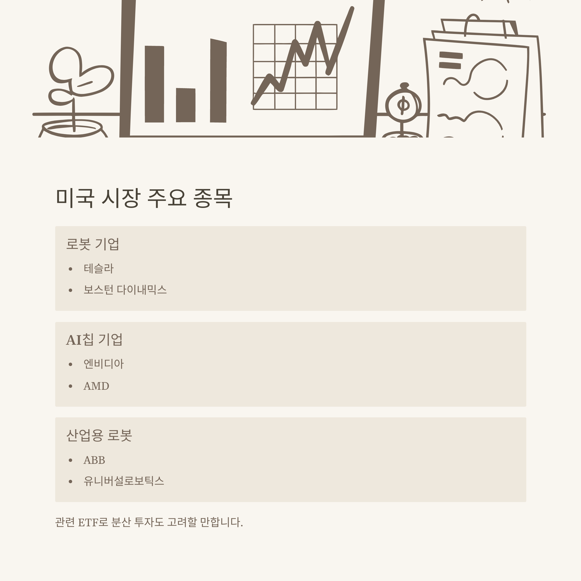 | 유럽·기타 | ABB, 유니버설로보틱스 | 산업용/서비스로봇, 부품 공급 | 글로벌 네트워크, 장기 성장성 |
