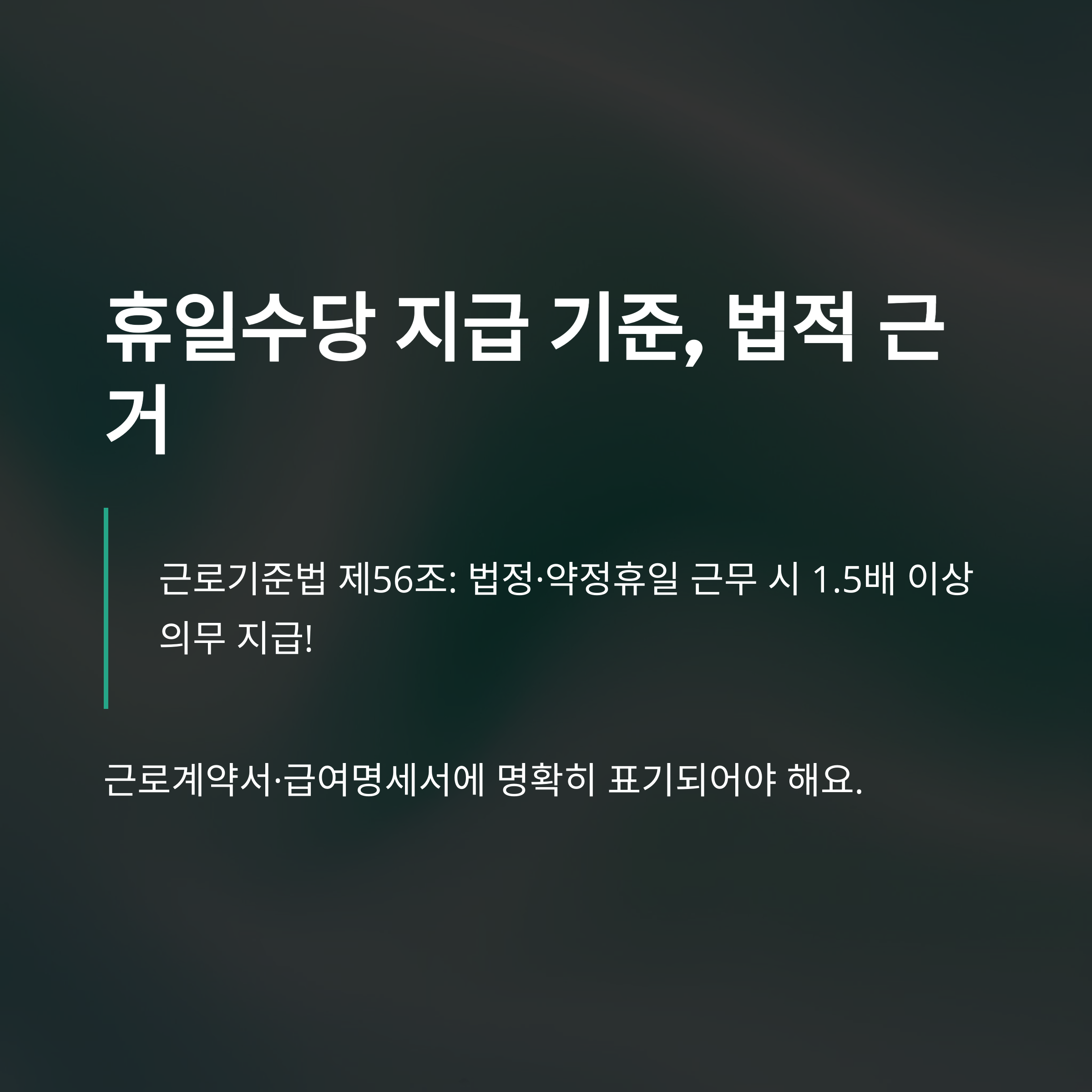 | 지급 기준 | 법정·약정 휴일 근로 시 1.5배 이상 | 근로기준법 제56조 |