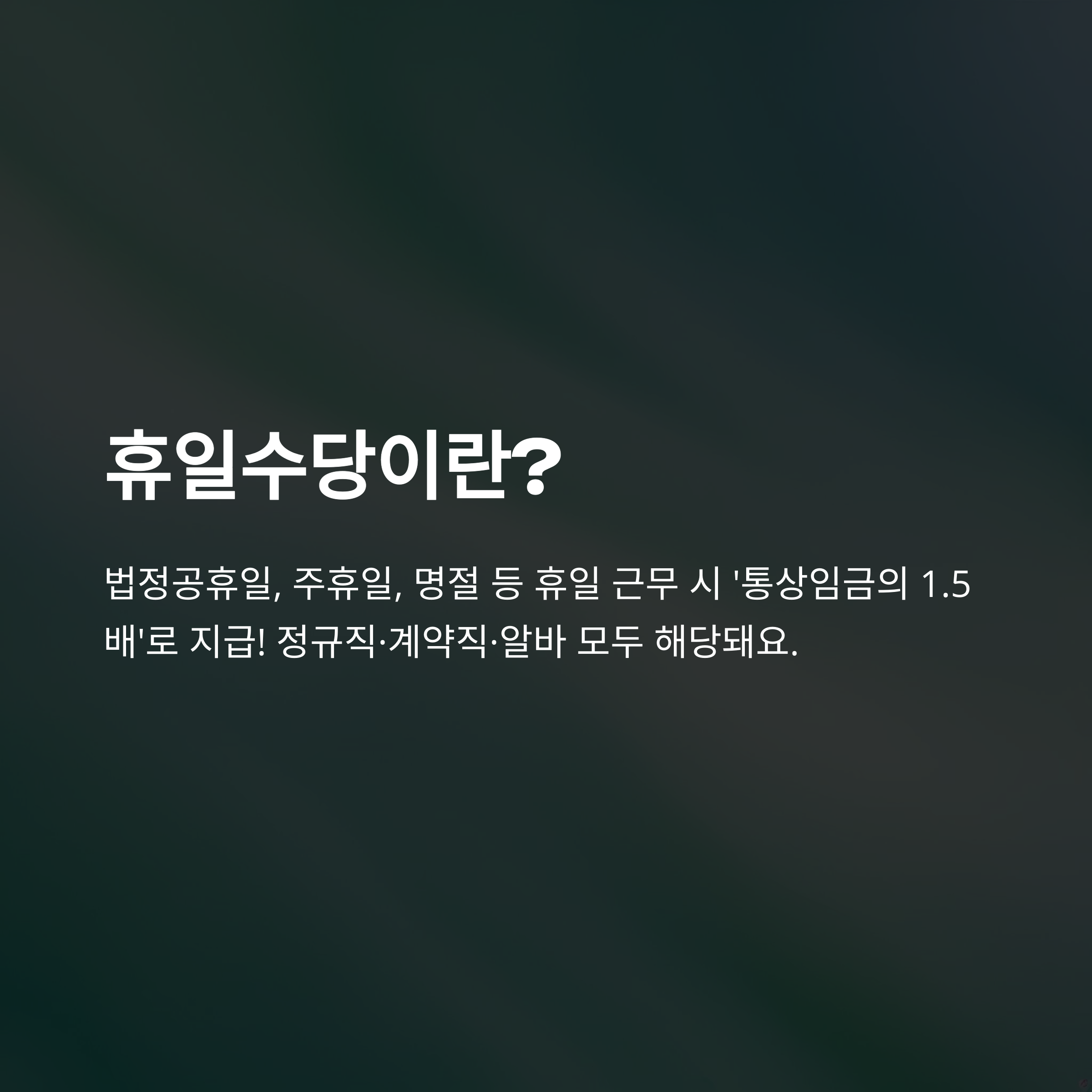 - 휴일근로수당: 주휴·공휴일 등 휴일 근로 시 1.5배