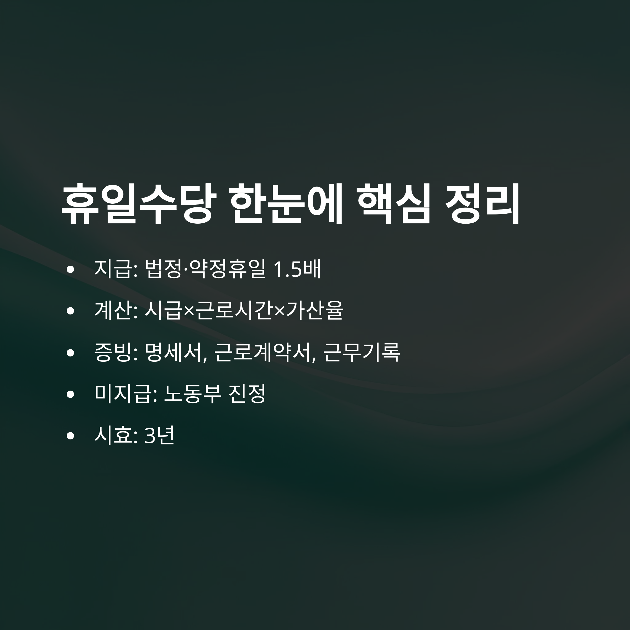휴일수당 미지급은 반드시 증빙자료를 챙겨 차분하게 절차를 밟으시길 권합니다.