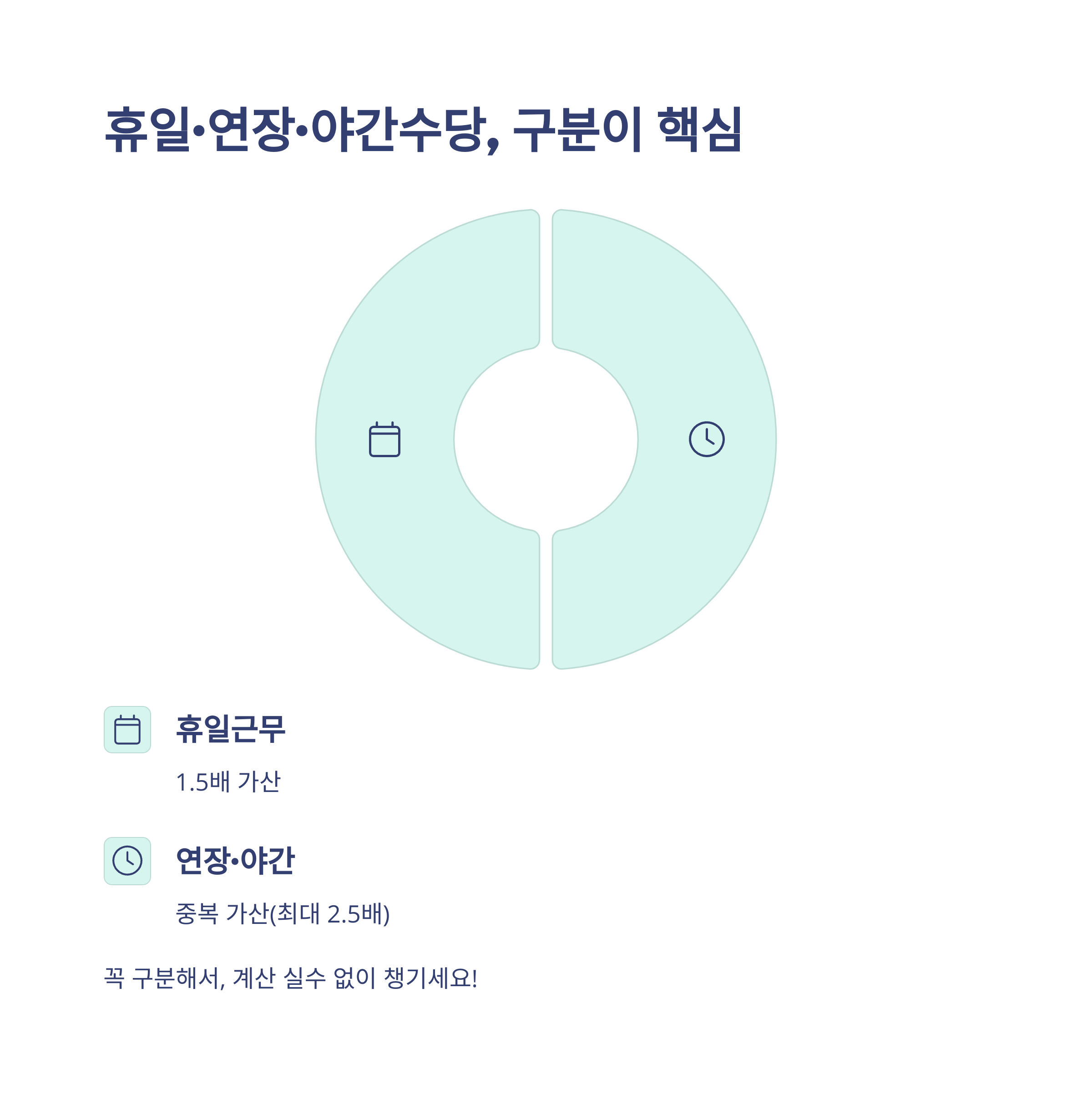 저도 처음엔 ‘휴일수당’ ‘연장수당’ ‘야간수당’이 무엇이 어떻게 다른지 혼동했었어요. 하지만 명확하게 구분해야 누락 없이 제대로 받을 수 있습니다. 휴일수당은 주휴일·공휴일 등 휴일 근무 시 1.5배 지급, 연장수당은 1일 8시간 또는 주 40시간 초과 근무시 1.5배, 야간수당은 밤 10시~다음날 6시 근로시 0.5배 가산됩니다. 휴일+연장+야간이 겹치면 중복 가산이 적용되어 최대 2.5배까지 받을 수 있죠.