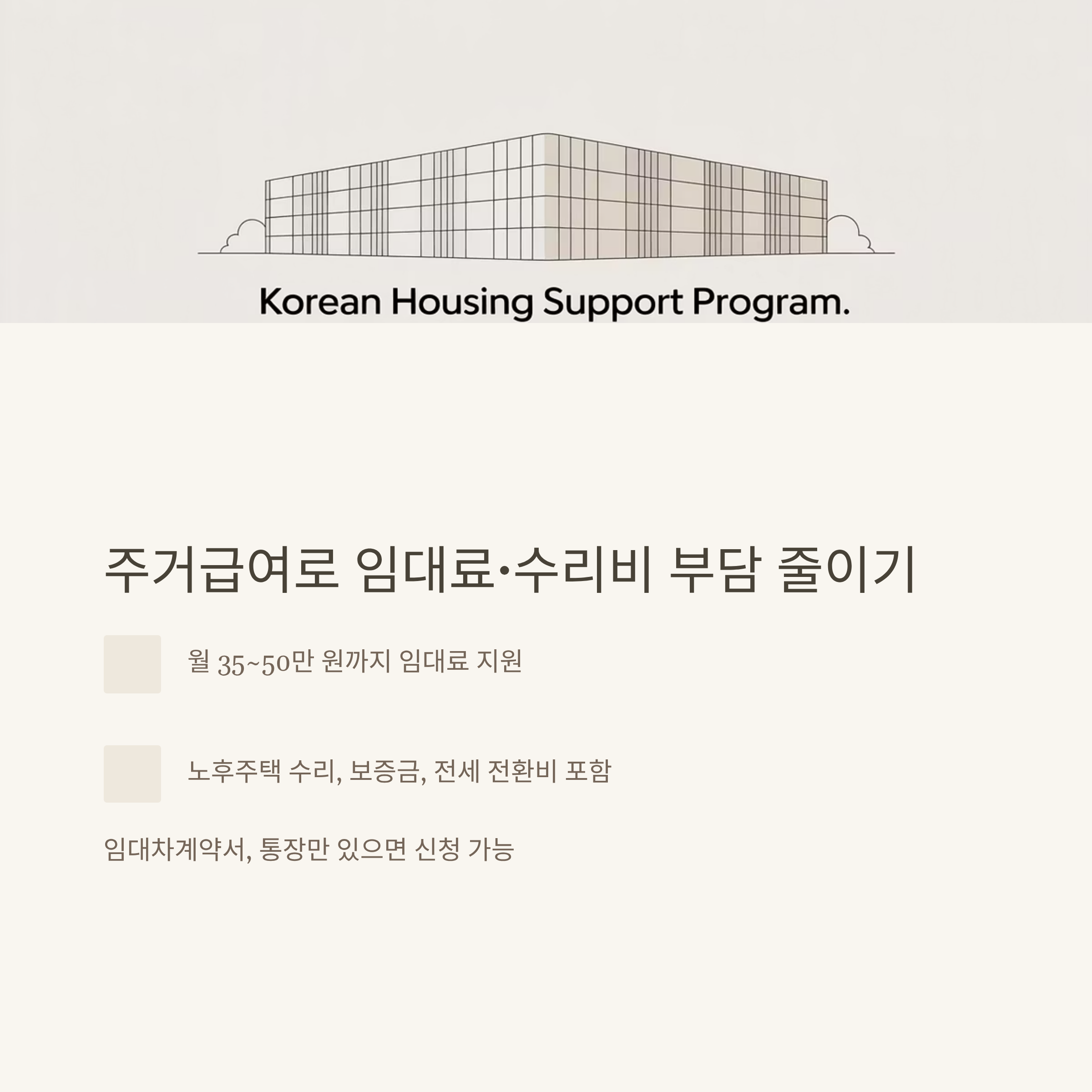 최신 주거급여·임대료 지원 기준은 정부24 주거급여 안내에서 꼭 확인하시기 바랍니다.