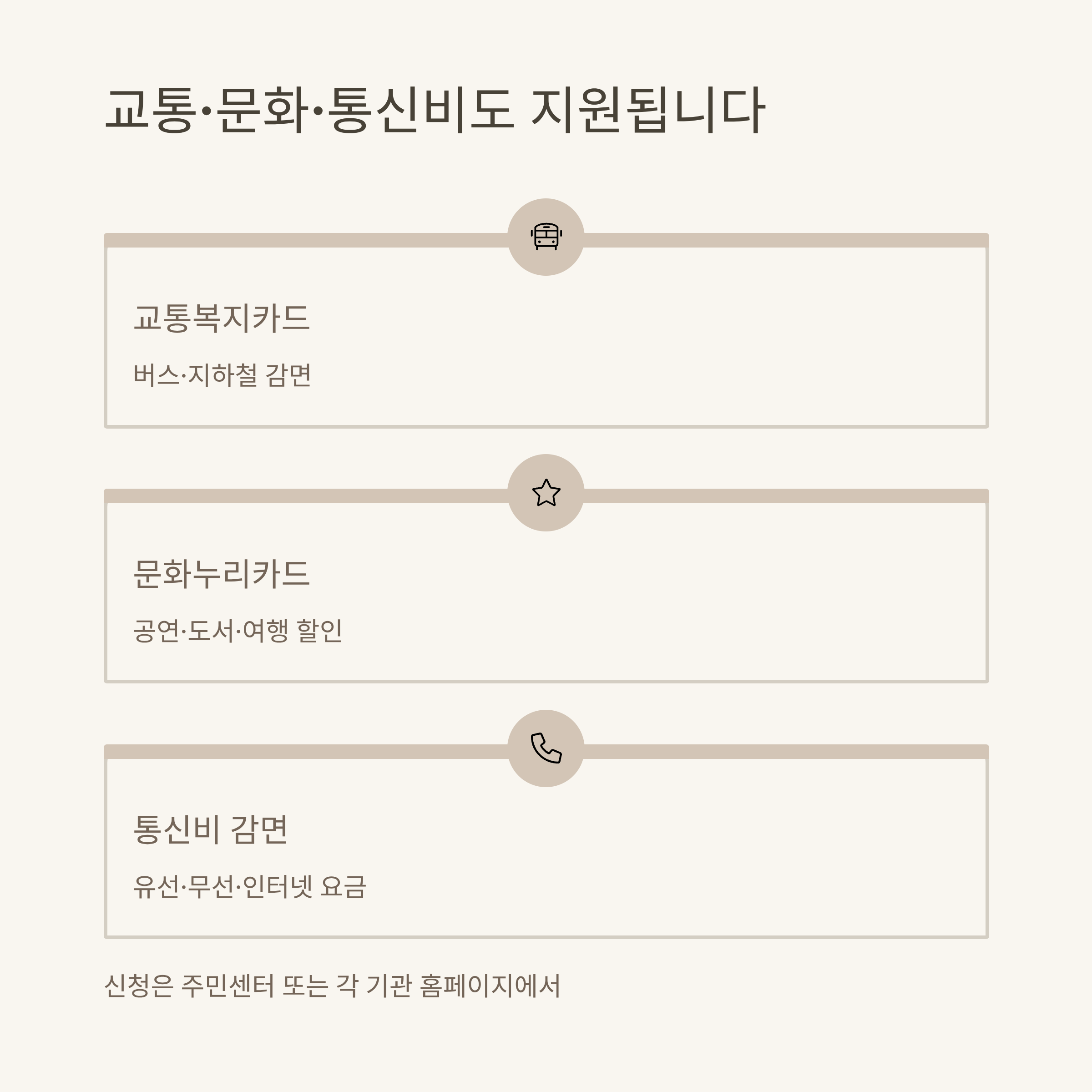 | 문화누리카드 | 영화·공연·여행 등 연 12만원 | 주민센터/문화누리 홈페이지 신청 |