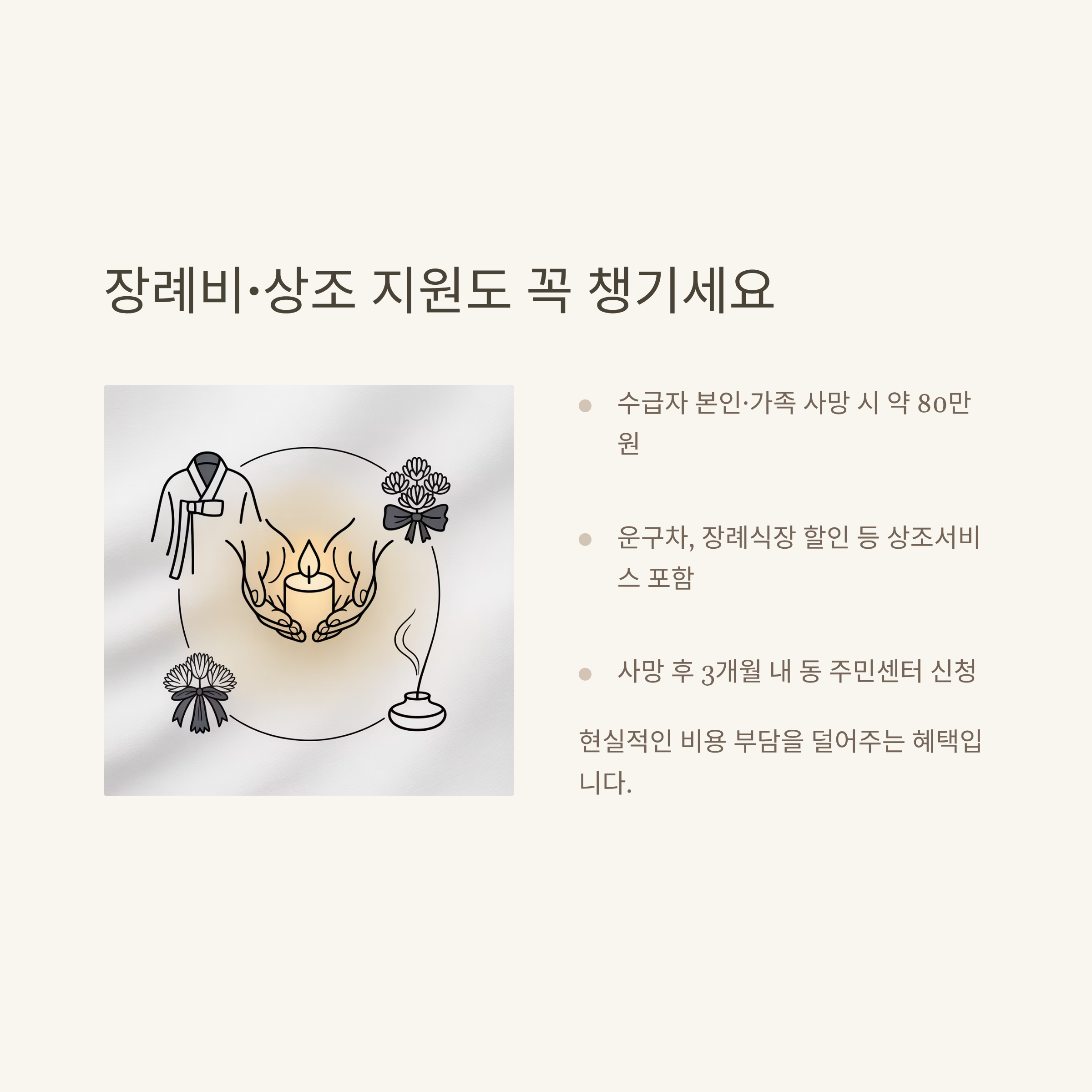 | 장례비·상조 | 본인·가족 사망 시 80만원 내외, 무료·할인 상조 |