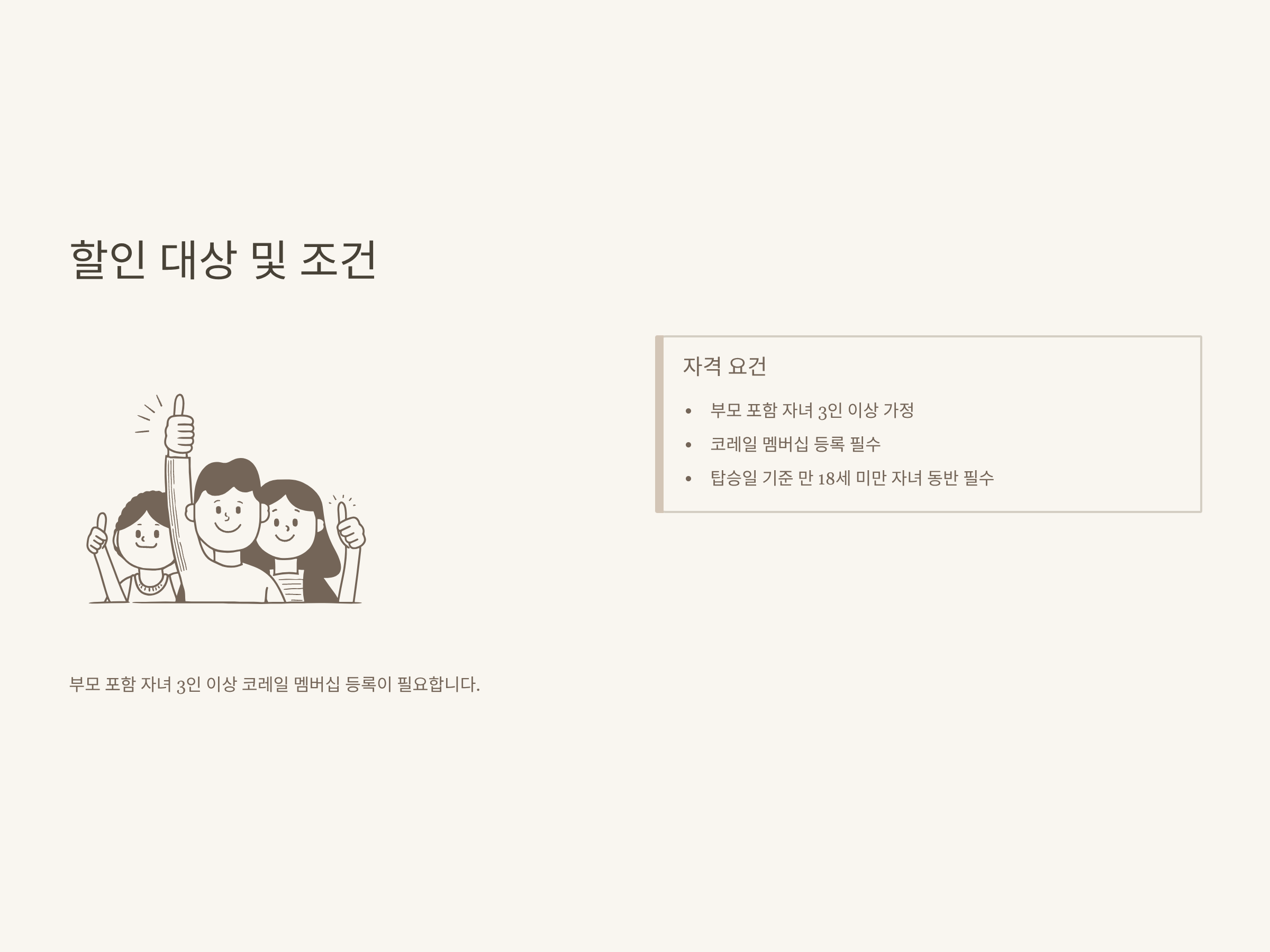 | 할인 대상 | 3자녀(만 18세 미만) 이상 가족 코레일 멤버십 등록 시 |