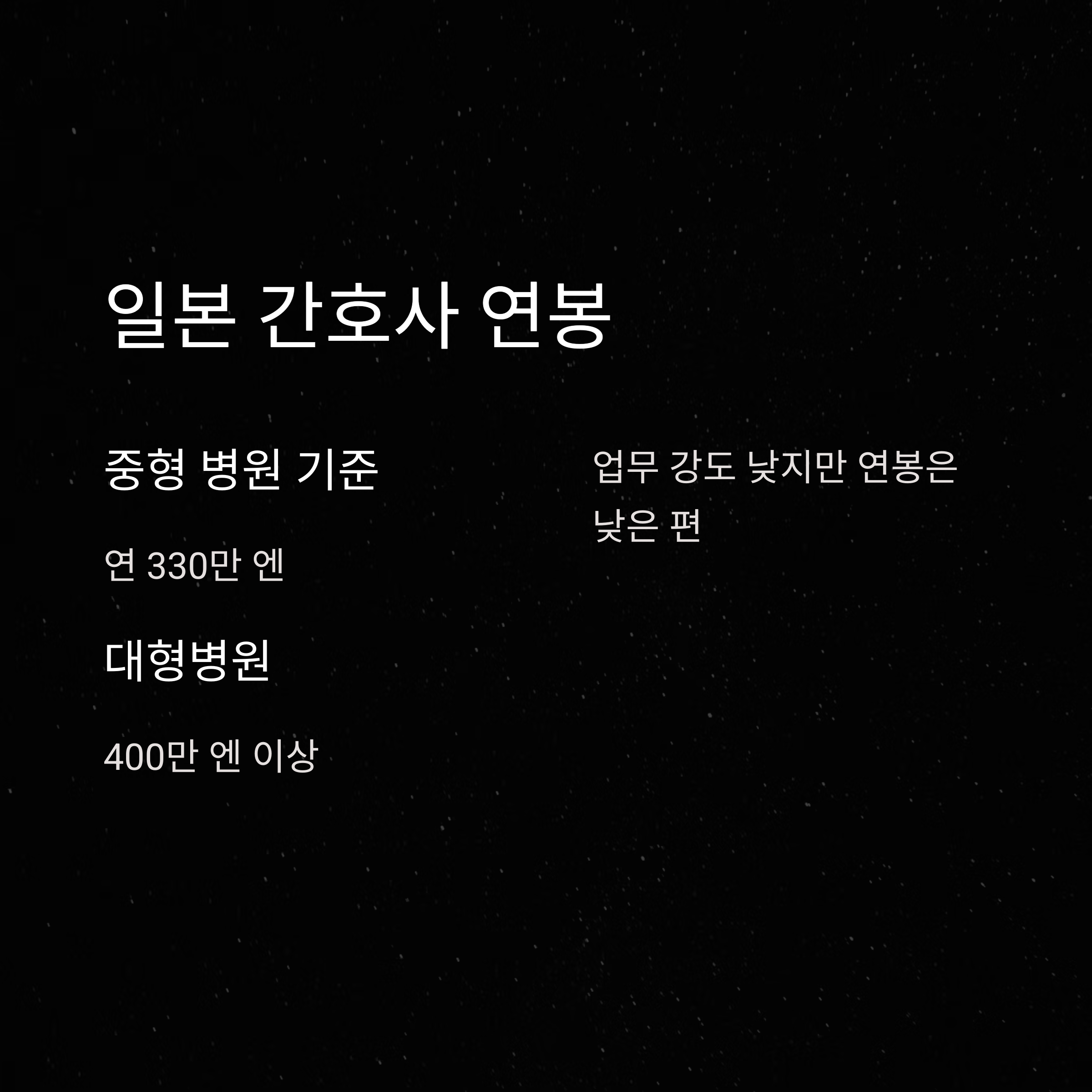 하지만 제 친구 중 한 명은 도쿄대학병원에 입사해서 연 400만 엔 이상을 받았다고 해요. 근무시간이 일정하고, 의료진과 간호사 간 분업이 명확해 정신적으로는 훨씬 편하다고 하더라고요.