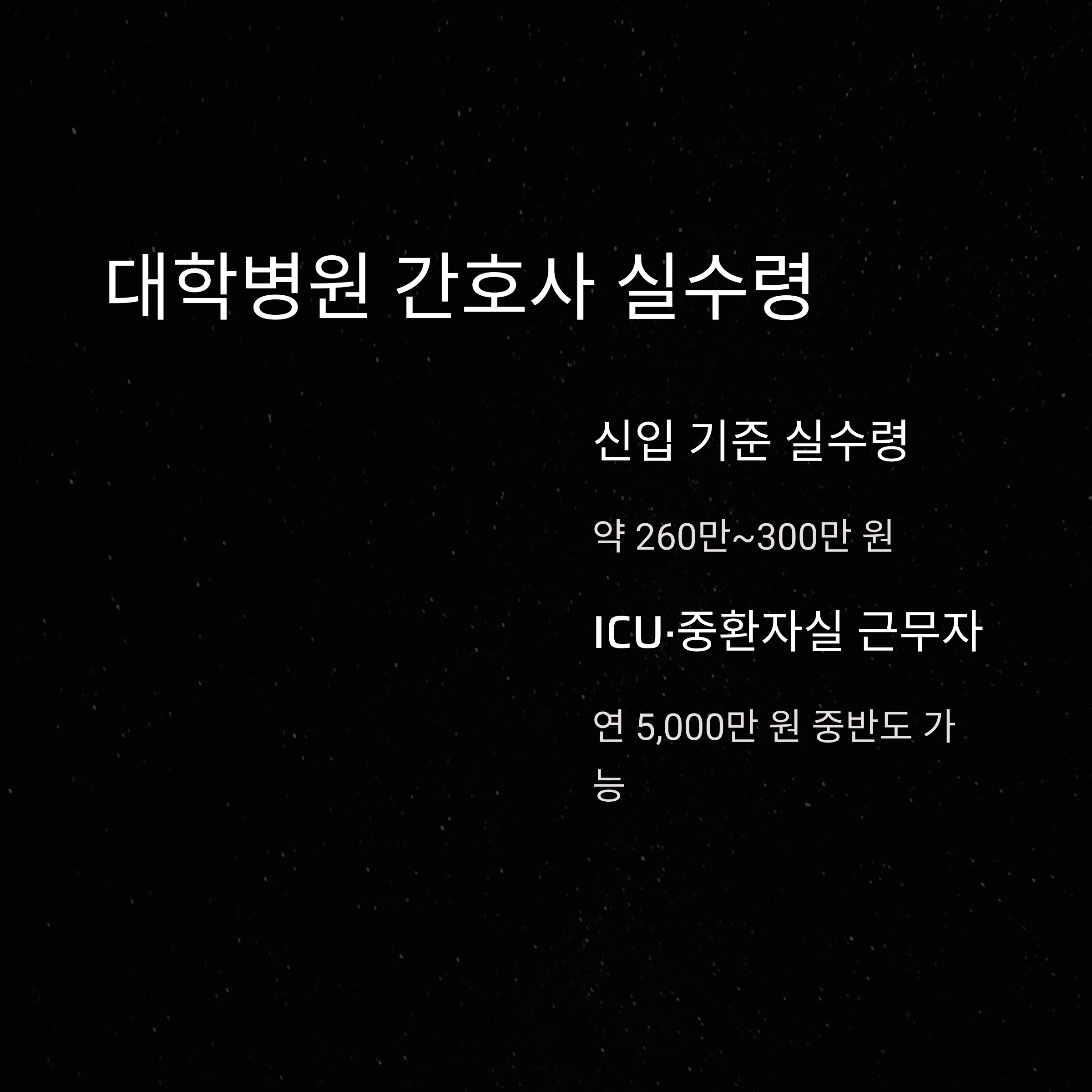 | 대학병원 | 4,500만 원 | 6,000만 원 이상 | 교대근무, 수당 많은 편 |
