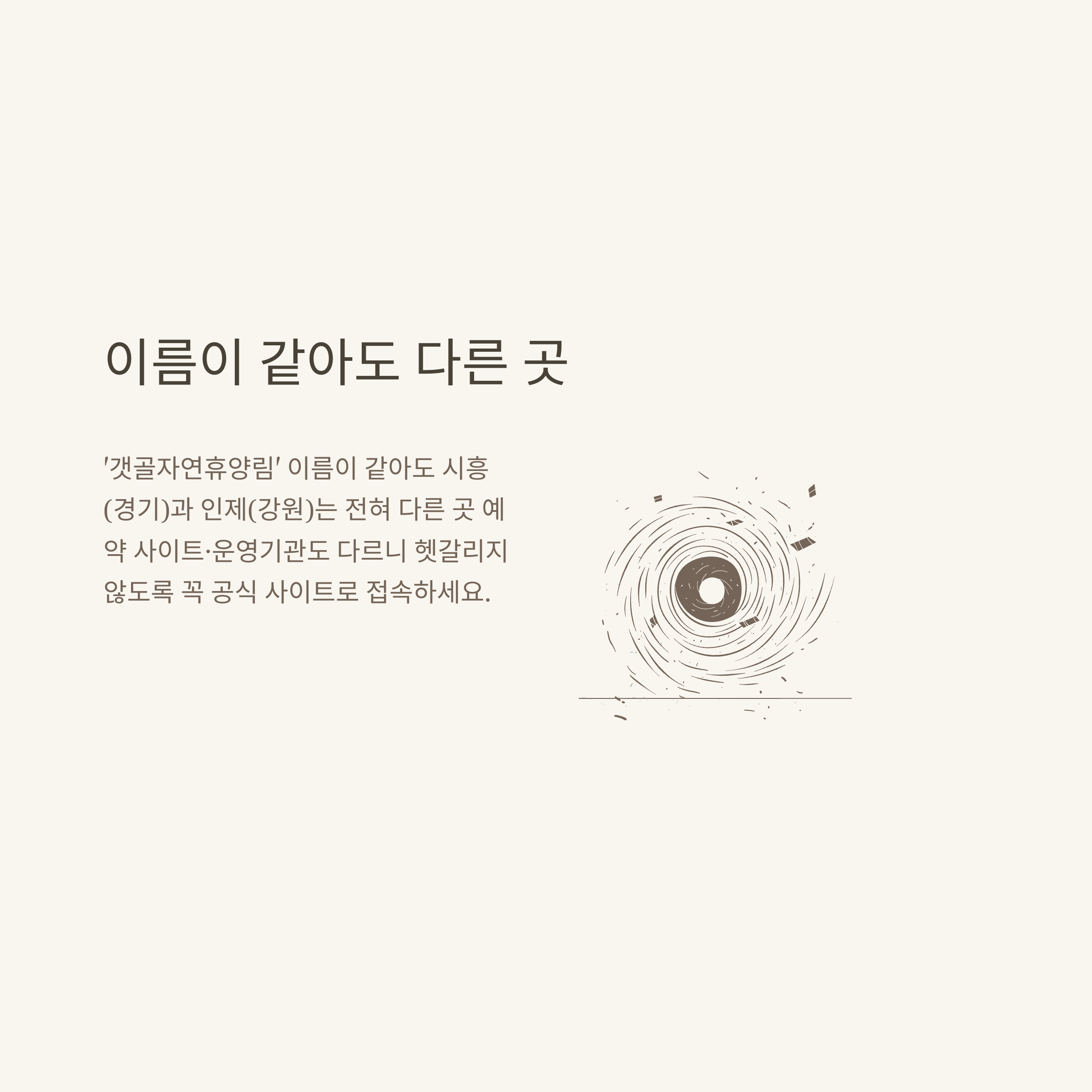 갯골자연휴양림이라고 검색하다 보면 ‘인제 갯골자연휴양림’이라는 이름도 자주 보게 됩니다. 저도 처음엔 헷갈렸는데, 실제로는 전혀 다른 지역에 위치한 별도의 휴양림이에요. 시흥 갯골자연휴양림(경기 시흥)과 인제 갯골자연휴양림(강원 인제군)은 운영기관, 예약 방식, 시설 등 모든 게 다릅니다.