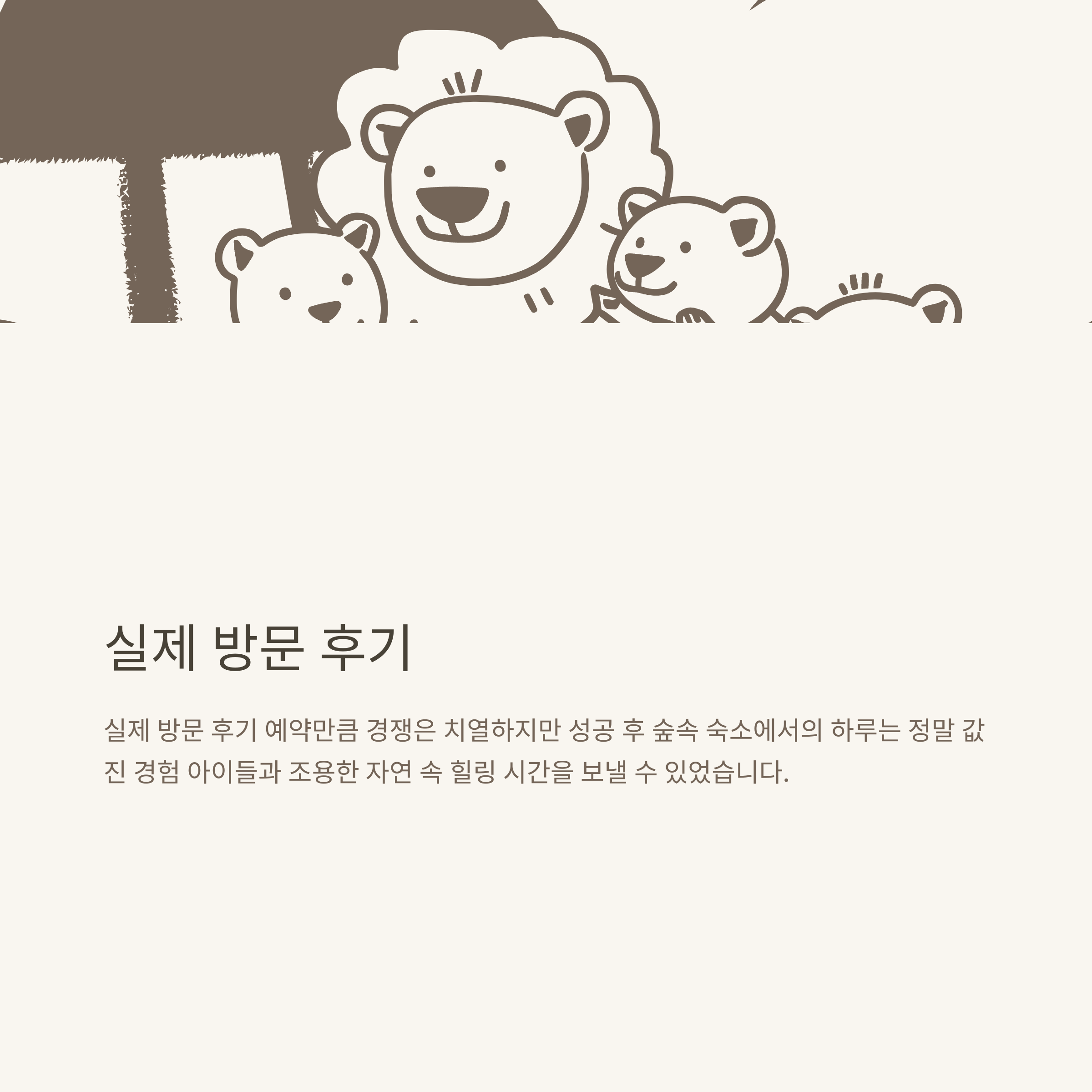 예약에 성공한 날, 마치 티켓팅 성공한 기분처럼 기뻤어요. 저희 가족은 숲속의 집 숙박동을 선택했고, 생각보다 방이 넓고 시설도 깔끔해서 아이들과 머무는 데 전혀 불편함이 없었습니다. 주변 산책로는 아이들이 뛰어놀기에 좋았고, 조용한 밤에는 새소리와 바람 소리만 들리니 그야말로 도심 속 힐링이라는 느낌이 강했습니다.