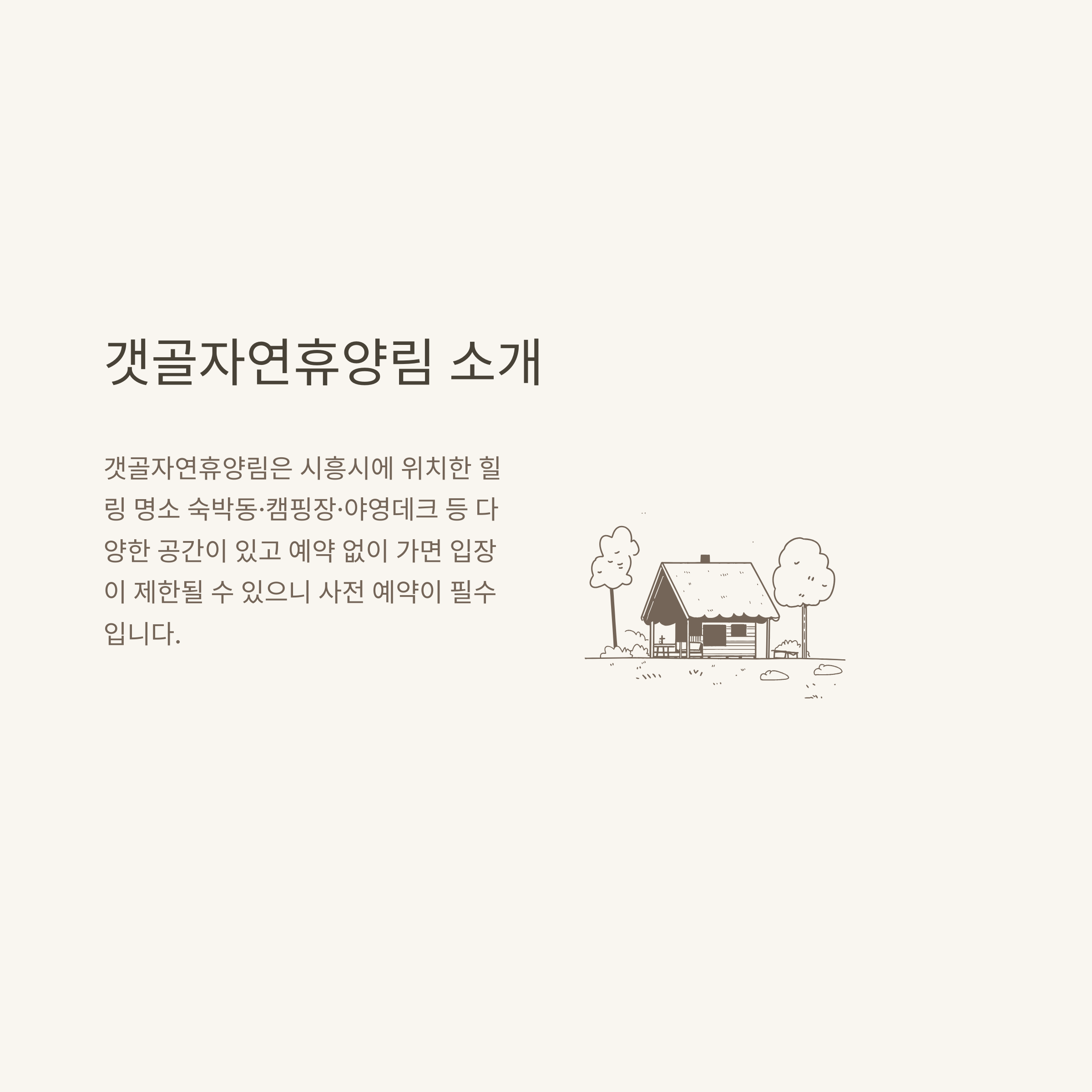 | 갯골자연휴양림 예약 | 공식 사이트 통한 실시간 예약, 오픈 시간 엄수 | 이동 |