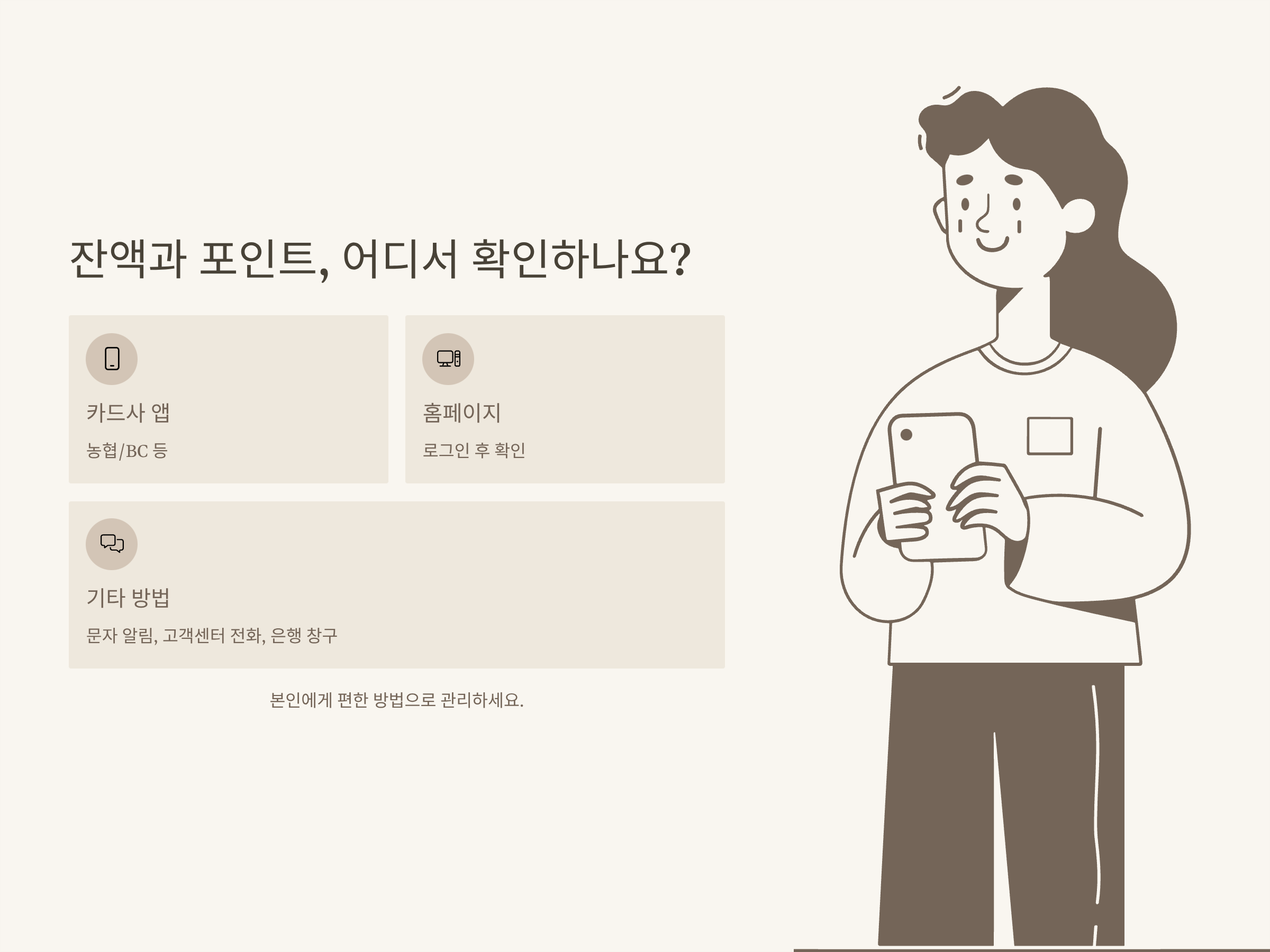 | 홈페이지(PC) | 농협·BC카드 등 로그인 후 확인 | 포인트/잔액 내역 확인 가능 |