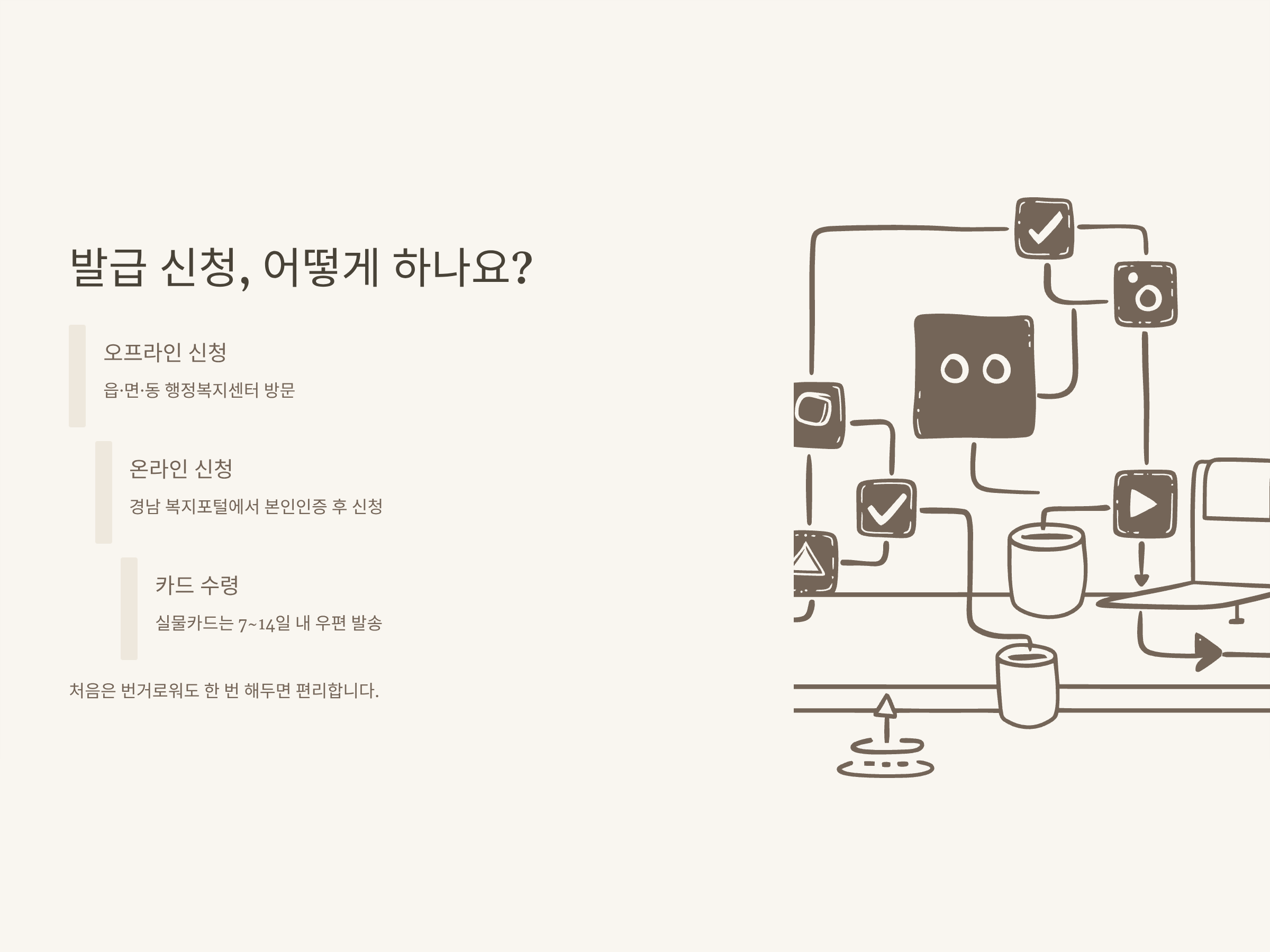 신청 즉시 접수 문자가 오고, 실물 카드는 약 7~14일 내 우편 발송됩니다. 신청방법 및 상세 안내는 경남 공식 홈페이지에서 바로 확인할 수 있습니다.