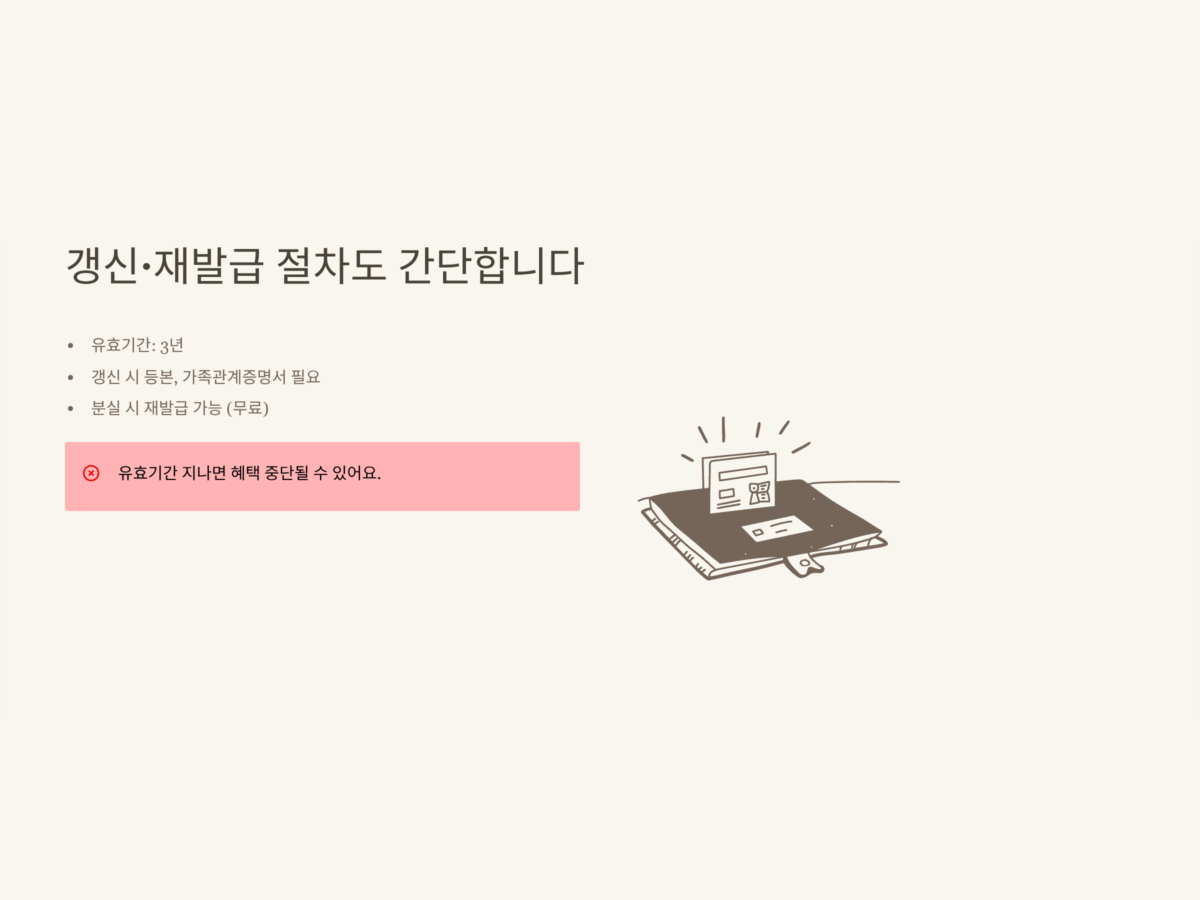 특히 자녀가 성년이 되거나 가족구성에 변화가 생기면, 반드시 등본·관계증명서 업데이트 후 재신청이 필요합니다. 경험상 재발급은 평일 오전이 처리 속도가 빨랐고, 갱신 기간이 지난 뒤에는 일시적으로 혜택이 중단될 수 있으니 유효기간은 꼭 미리 체크하시길 권장합니다.
