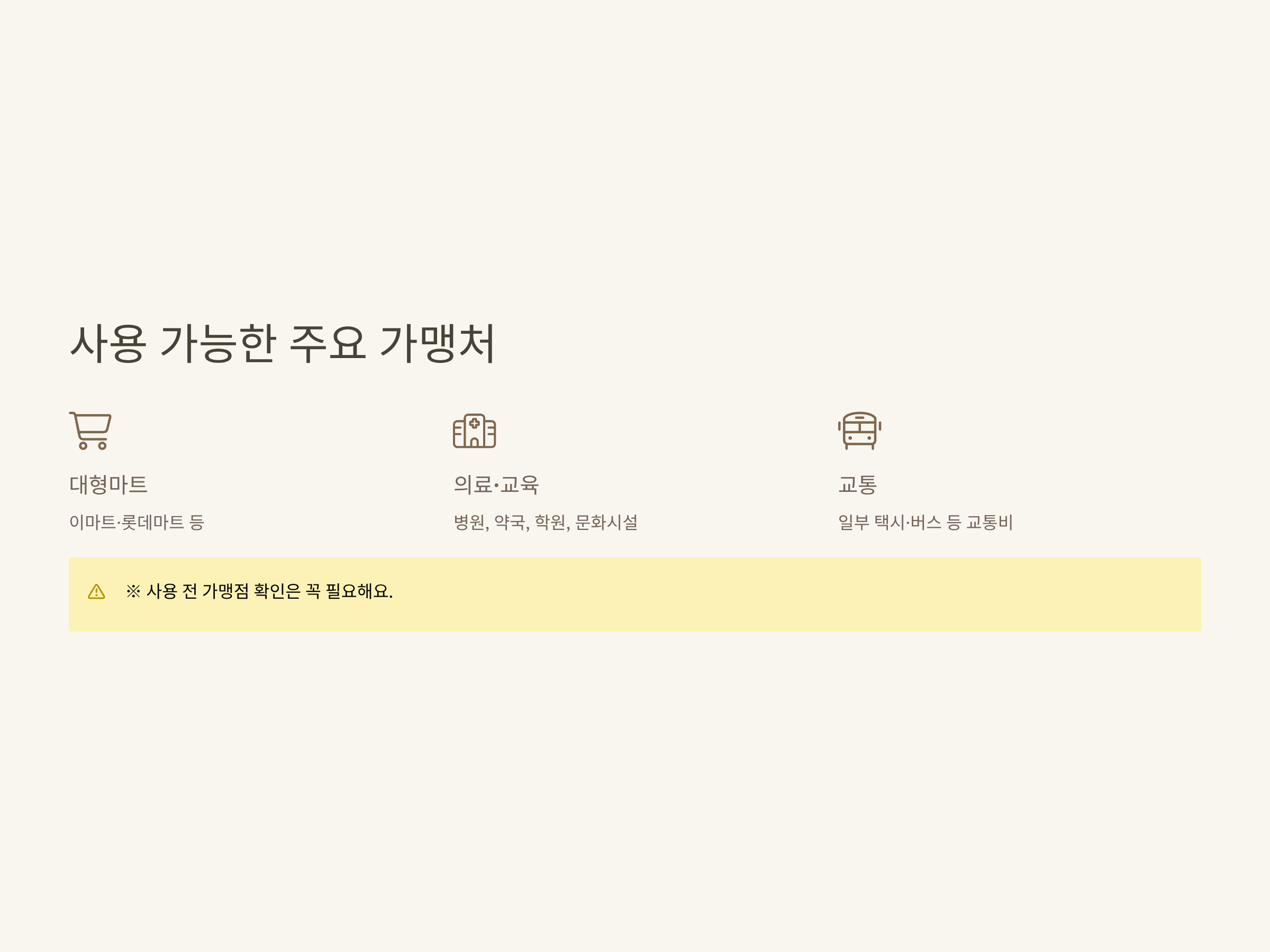 | 사용처 | 마트, 학원, 병원, 교통, 공공시설 등 | 공식 가맹점 확인 |