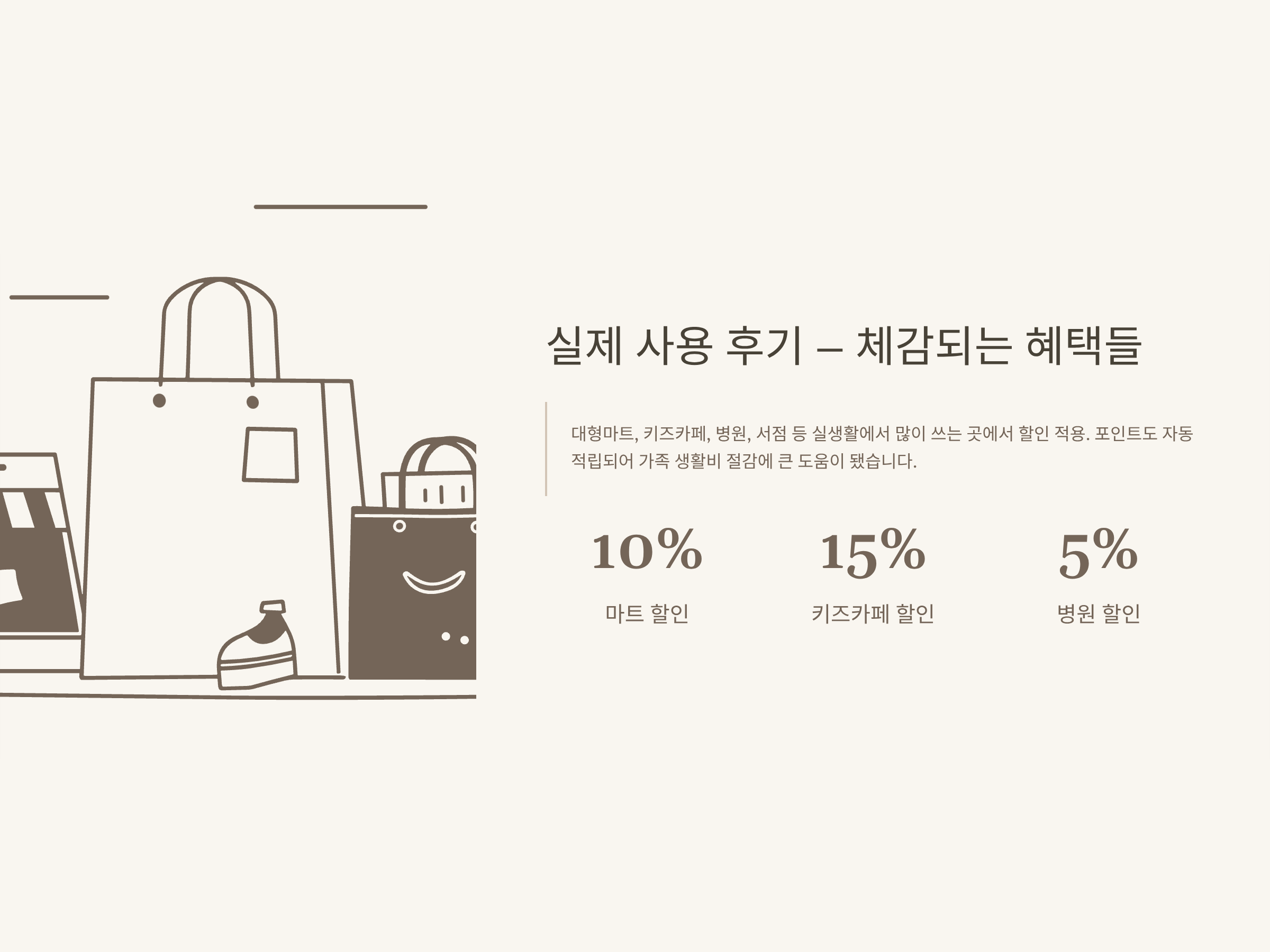 제가 가장 유용하게 썼던 곳은 대형마트, 키즈카페, 의료기관, 서점 등 실생활 가맹점이었습니다. 특히 특정 행사기간에는 포인트 적립률이 높아지거나, 가맹점에서 추가 이벤트를 진행해 체감 혜택이 확실히 늘었습니다.
