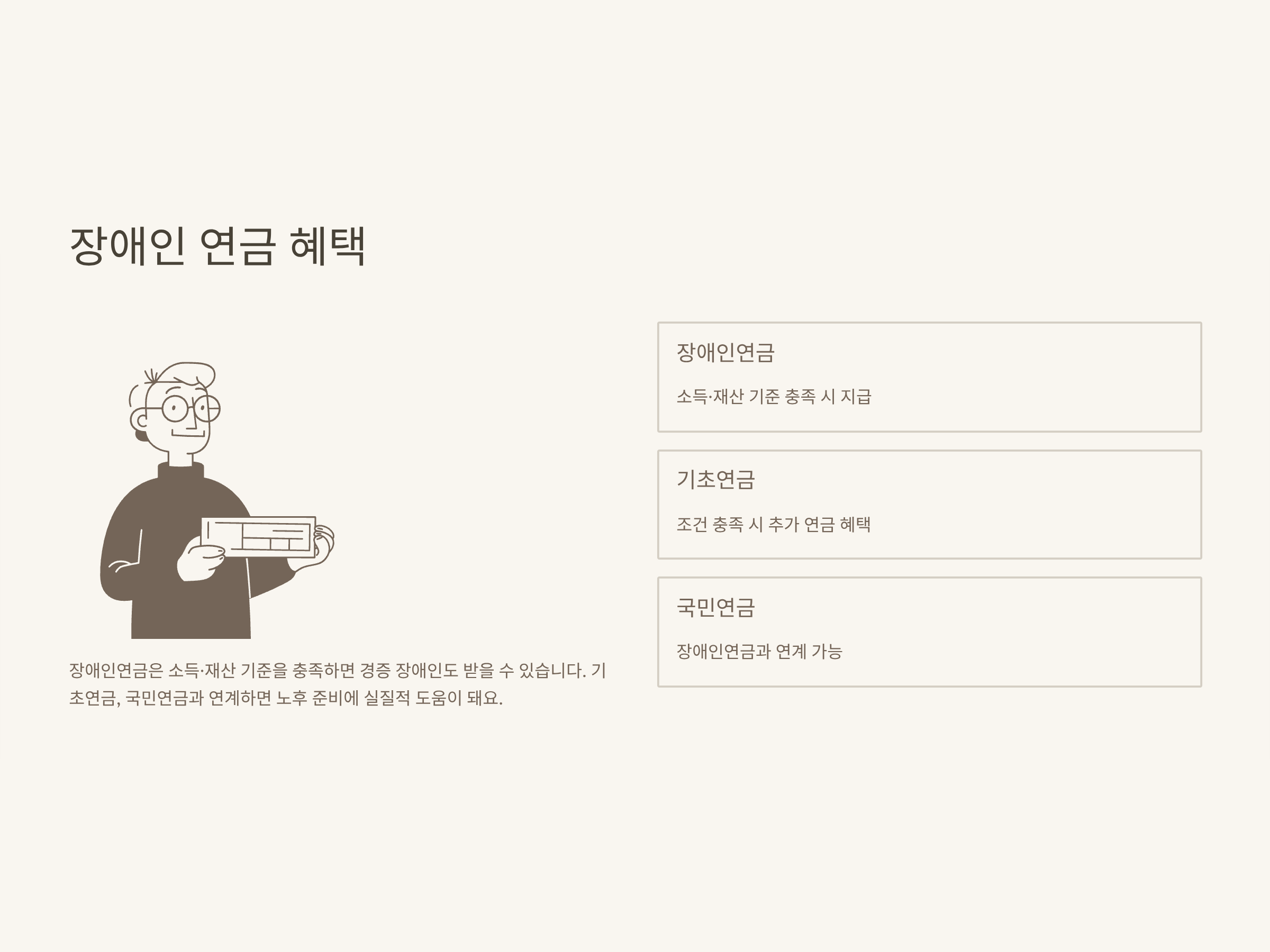 - 장애인연금, 기초연금 등 노후 복지 지원