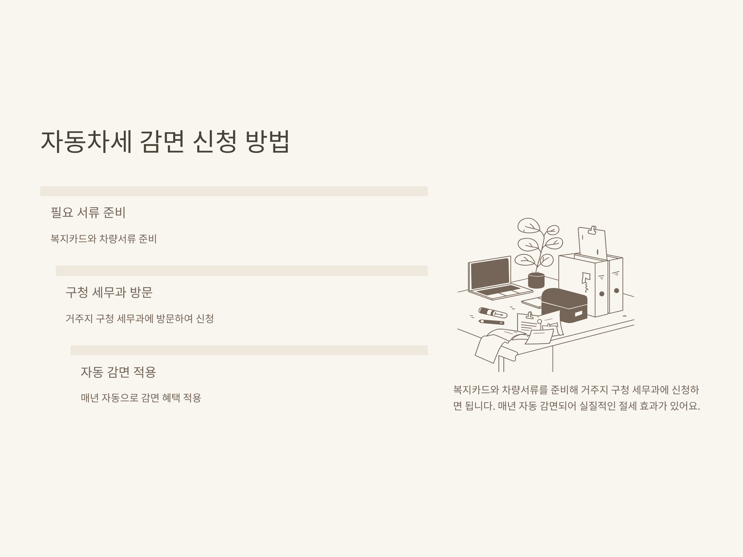 | 자동차세 | 1대 한정, 전액 또는 50% 감면 | 거주지 관할 구청 세무과 방문 |