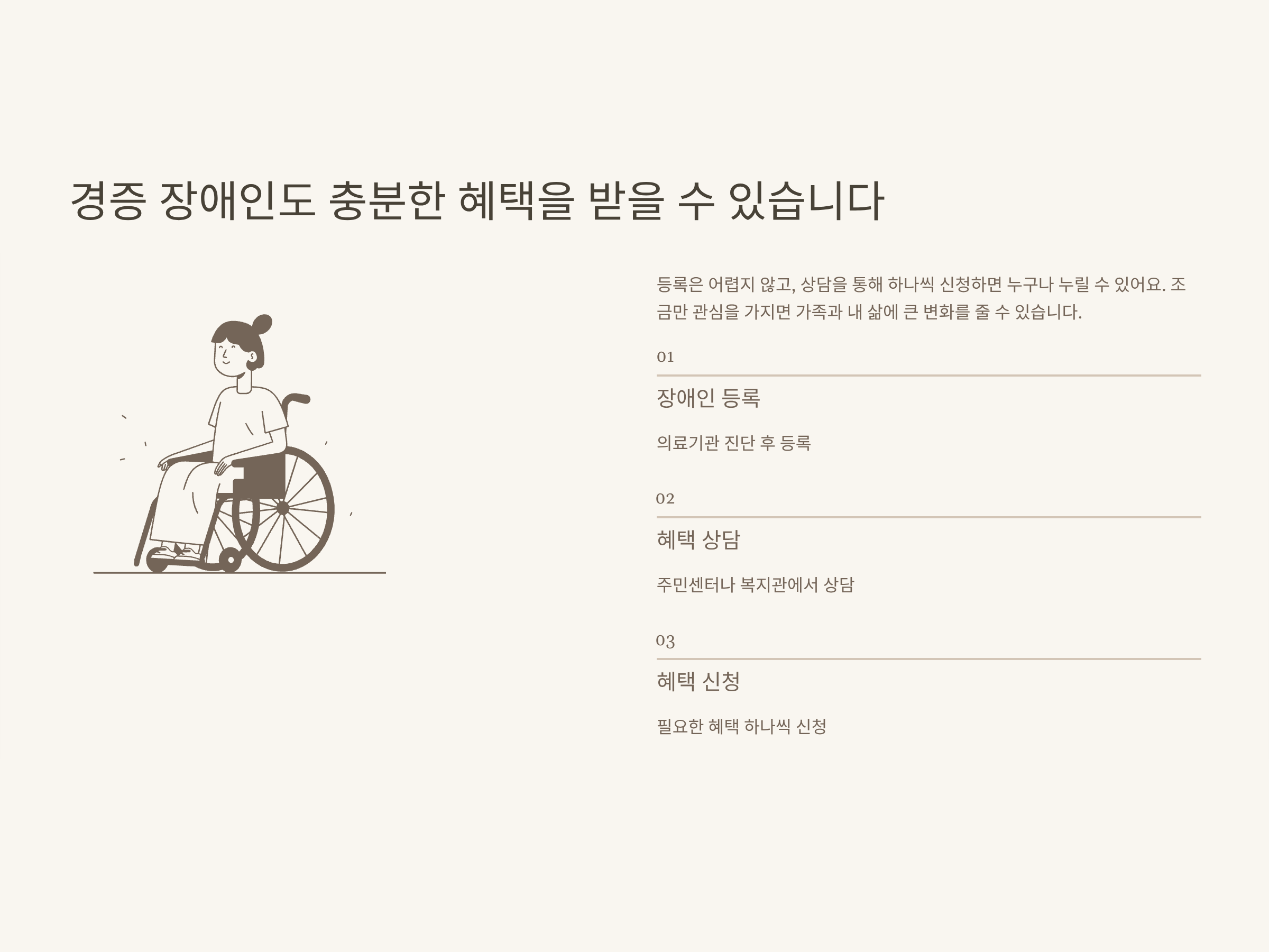 혹시라도 "나는 경증이라 별 혜택이 없을 거야"라고 생각하고 계신다면, 꼭 직접 상담 한 번 받아보시길 진심으로 추천드립니다. 실제로 등록하고 나면 생각보다 생활이 많이 달라집니다.