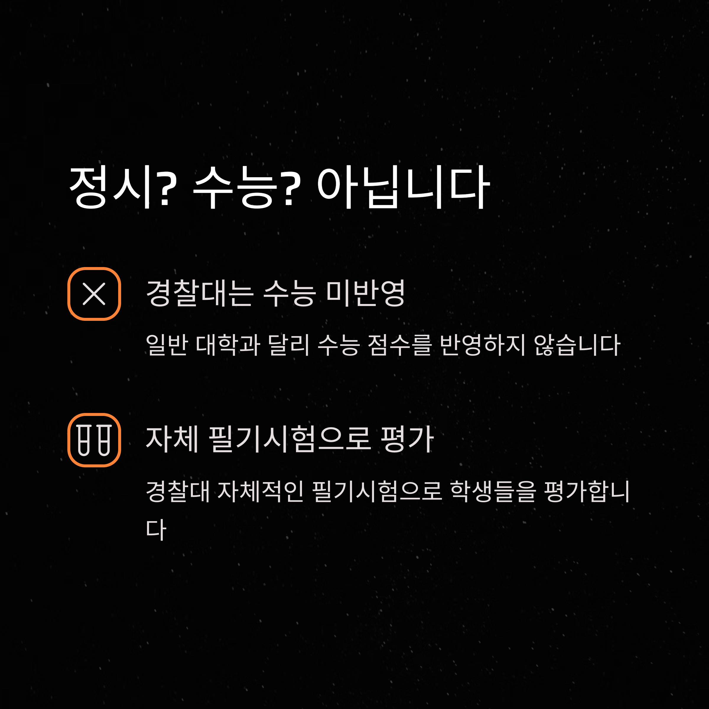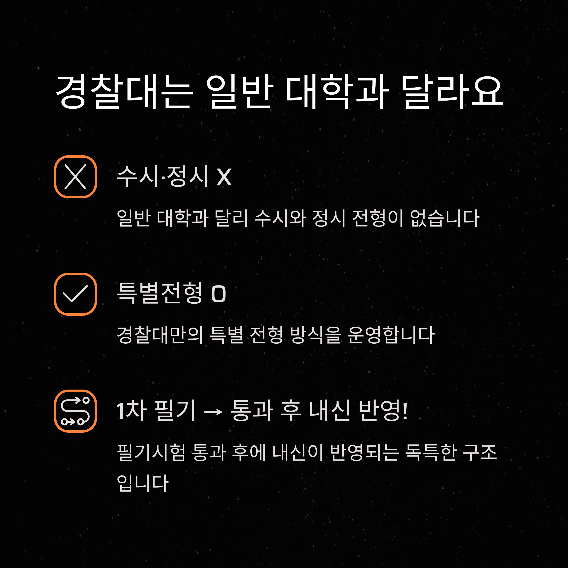 많은 분들이 헷갈리시는 부분 중 하나가 '경찰대 정시'라는 개념입니다. 저도 처음엔 경찰대가 정시 모집을 하는 줄 알고 일반 대학 정시 전략과 병행했었는데, 사실 경찰대는 정시모집이 존재하지 않습니다. 다시 말해, 교육부가 분류하는 '정시' 개념과는 무관하게 독립적인 전형을 운영하는 거죠.