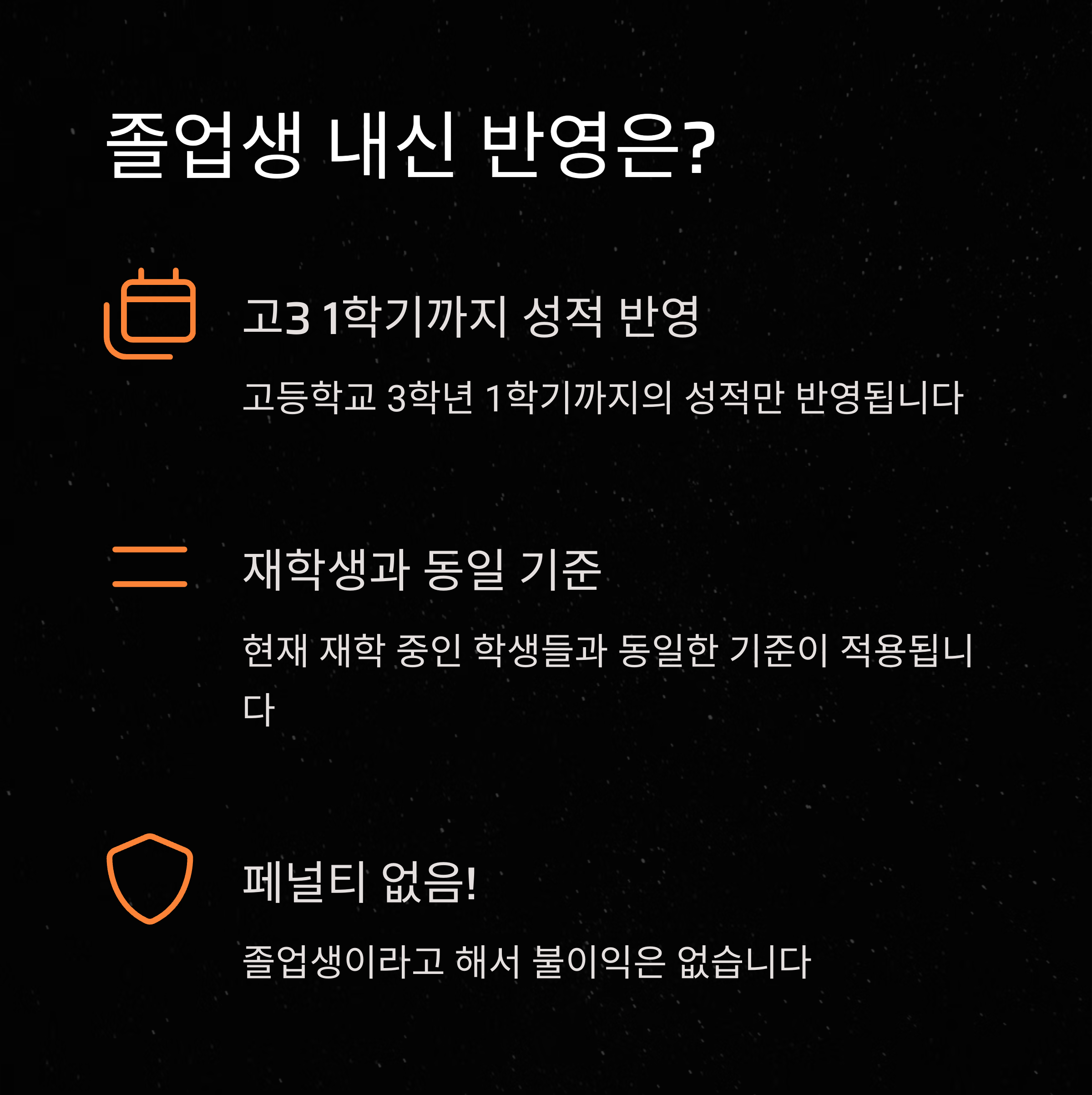 중요한 점은 졸업생도 재학생과 동일한 반영 기준을 따른다는 것입니다. 일부 사관학교처럼 졸업생에게 불이익이 있진 않지만, 고등학교 성적이 모든 평가 기준의 기반이 되기 때문에 내신이 약한 졸업생은 필기시험, 체력검사 등 다른 요소에서 만회를 노려야 합니다.