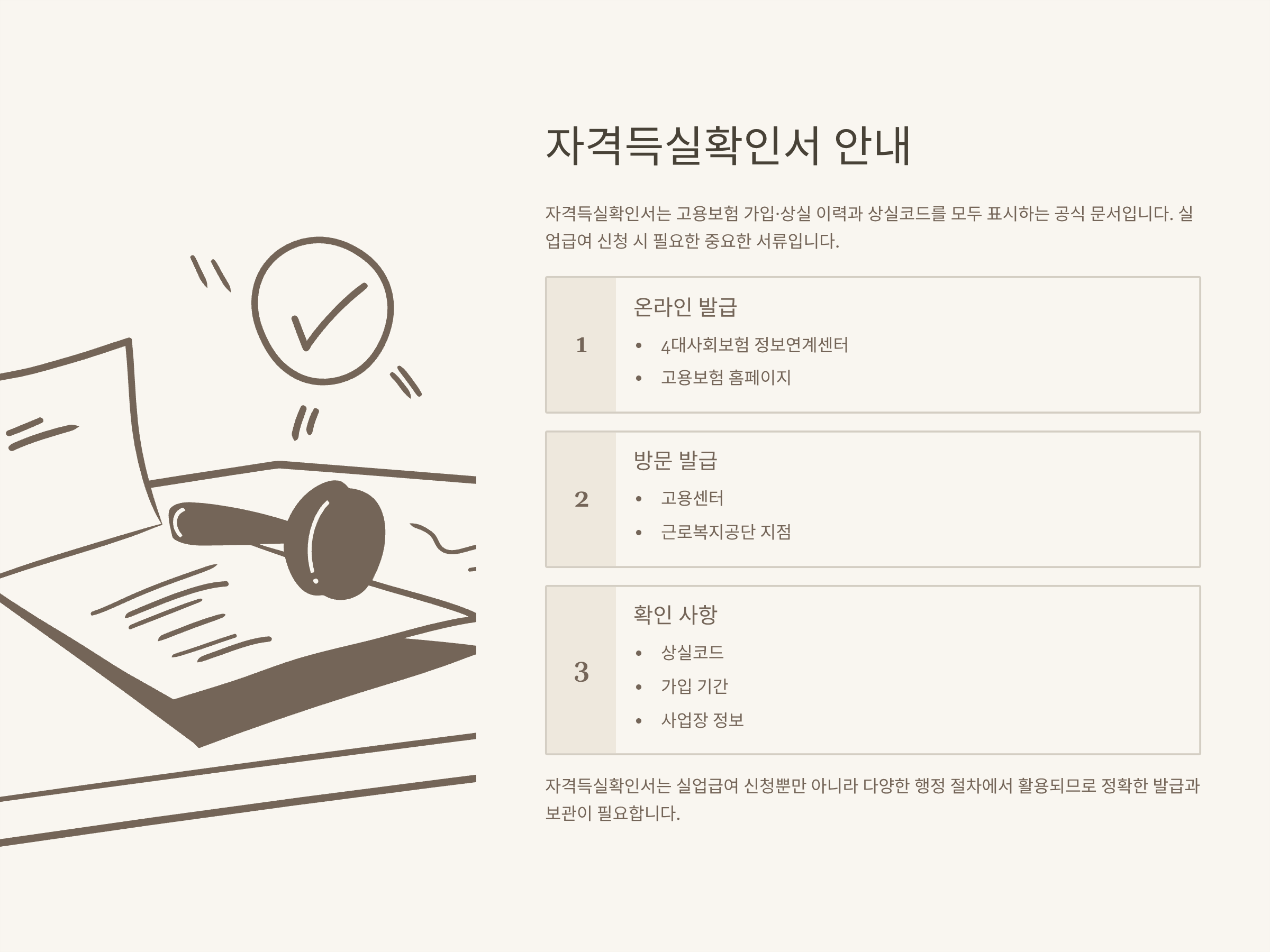 - 온라인: 고용보험 홈페이지 → 개인서비스 → 자격이력조회