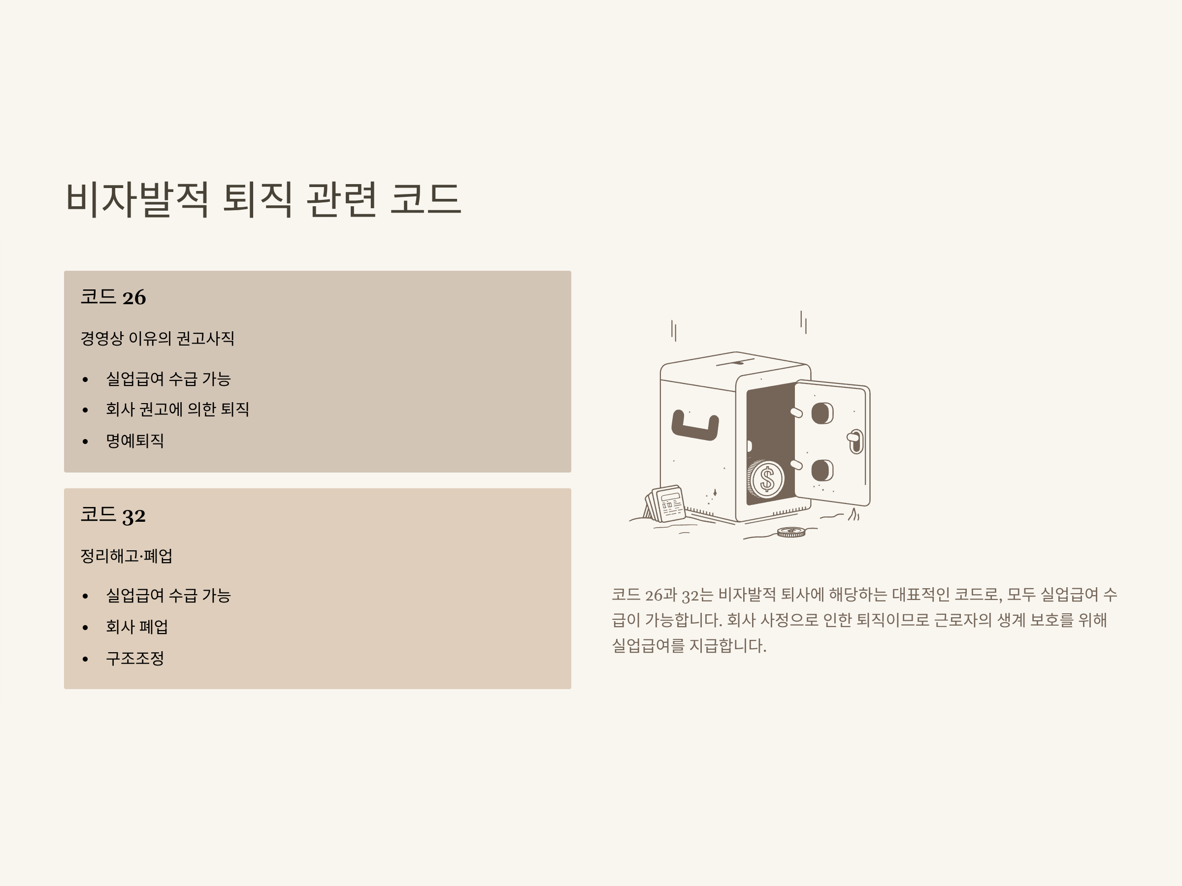 26번과 32번은 권고사직·정리해고와 관련된 코드입니다. 제가 주변 사례를 봤을 때, 이 두 코드는 실업급여 수급 가능성이 높은 편에 속했습니다.