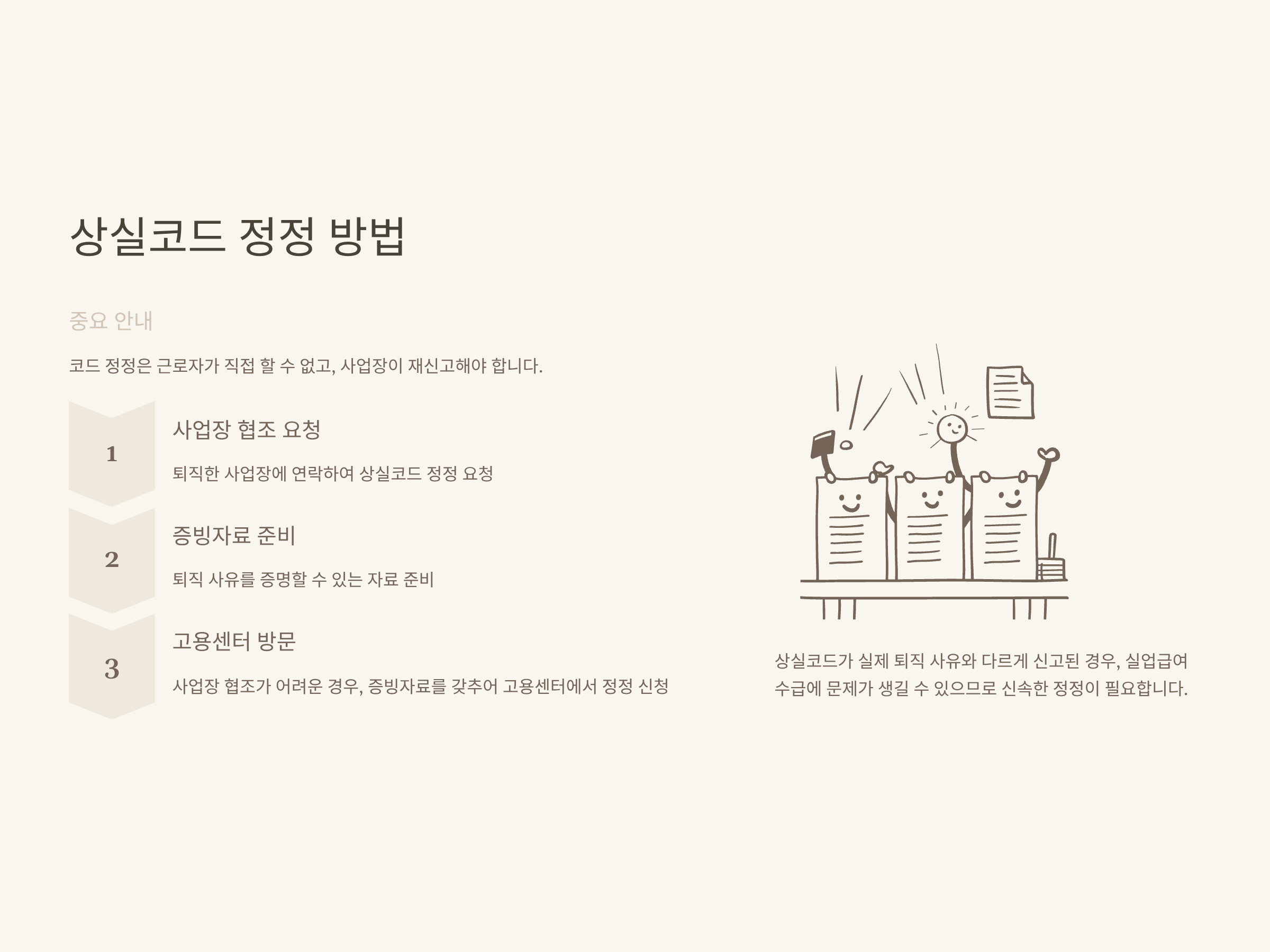 상실코드가 잘못 입력되면 실업급여 수급에 직접적인 영향을 미칩니다. 저 역시 예전에 자진퇴사로 잘못 신고된 경험이 있었는데, 고용센터 상담을 통해 정정 절차를 밟았습니다. 우선 근로자가 직접 코드를 수정할 수 없기 때문에, 사업장이 근로복지공단 또는 고용보험 EDI를 통해 재신고해야 합니다. 만약 사업장이 폐업했거나 협조가 어려운 경우, 퇴직증명서·근로계약서·임금체불확인서 등 객관적 자료를 제출해 고용센터에서 정정 요청이 가능합니다. 이때 심사 기간이 길어질 수 있으니, 실업급여 신청 예정일 이전에 반드시 처리하는 것이 중요합니다.