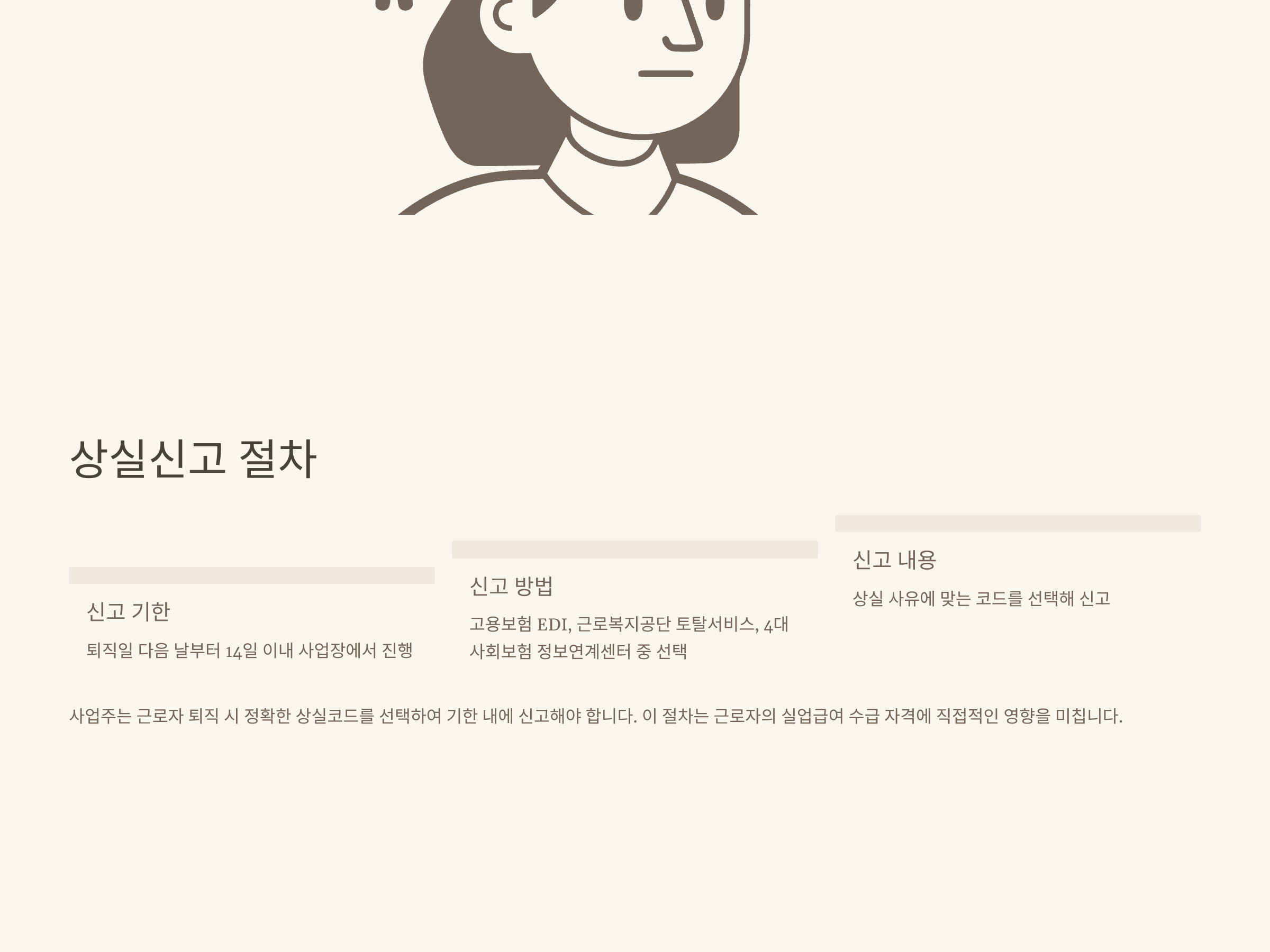 상실코드는 ‘상실신고’ 과정에서 자동으로 기록됩니다. 저는 퇴직한 뒤 4대보험 담당자가 상실신고를 처리하면서 함께 코드가 부여되었는데, 근로자가 직접 변경 신청을 할 수는 없습니다. 절차는 보통 다음과 같습니다. 사업장에서 퇴직일 다음 날부터 14일 이내에 상실신고를 해야 하며, 이때 고용보험 상실 사유에 맞는 코드를 선택합니다. 상실신고는 4대사회보험 정보연계센터, 고용보험 EDI, 근로복지공단 토탈서비스 등을 통해 가능합니다.