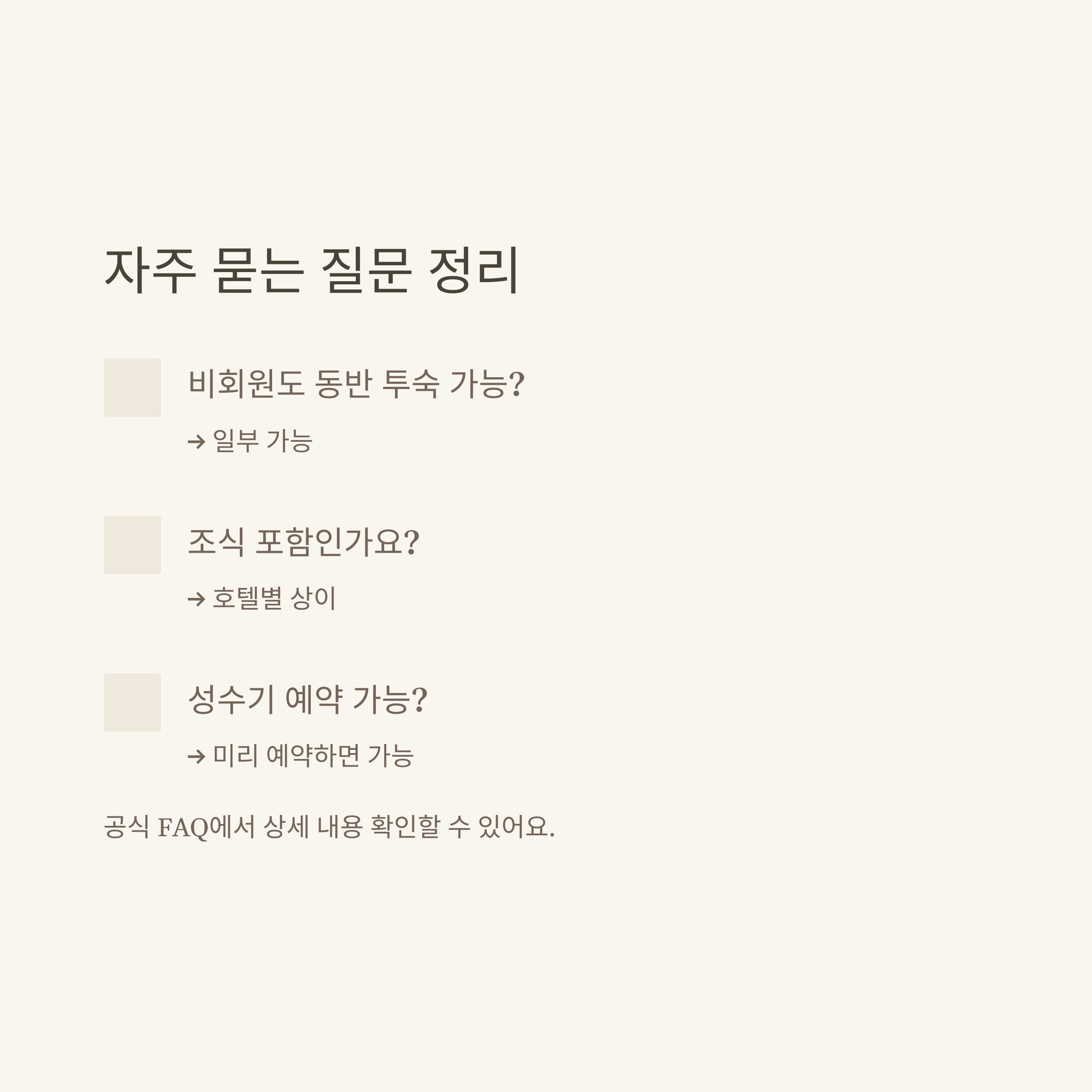 A. 호텔마다 다르지만 비수기에는 30~40%, 성수기에는 10~20% 수준의 할인율이 일반적입니다. 최신 할인율은 공식 안내에서 확인 가능합니다. - Q3. 비회원(지인, 친구 등)도 동반 투숙이 가능한가요?