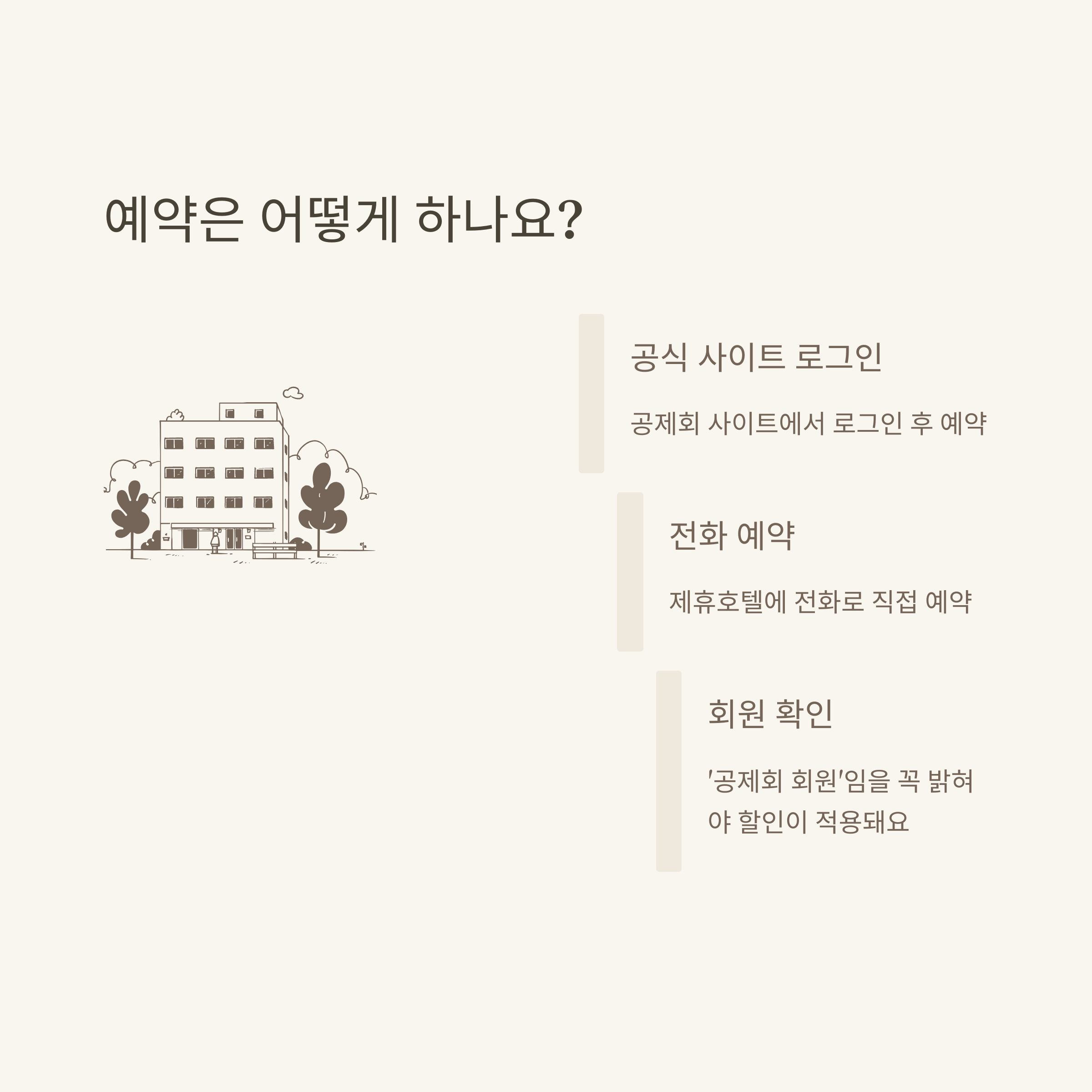 - 공제회 공식 채널 이외에서 예약하면 할인 적용이 안 됨