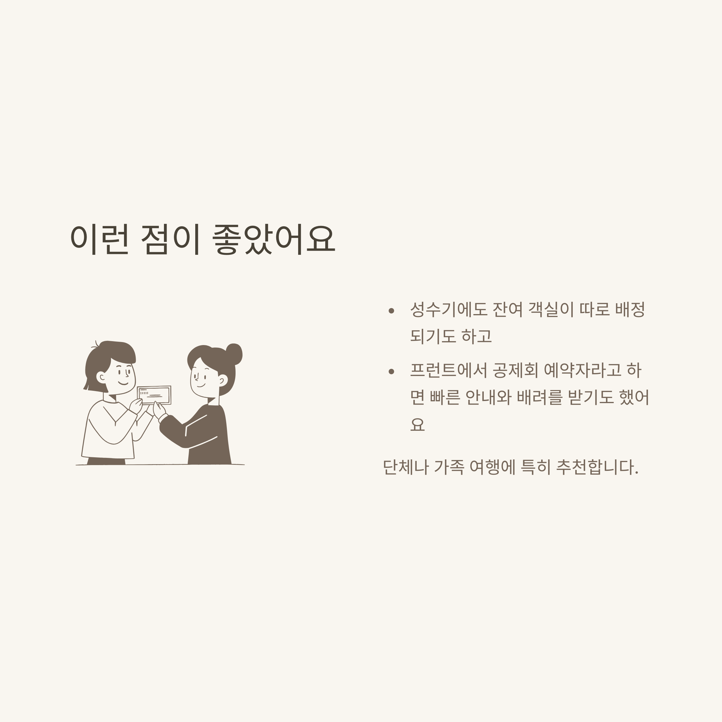 가족여행, 단체 MT, 워크샵 등 다양한 상황에 활용해봤는데, 객실 컨디션이나 추가 서비스도 일반 예약 대비 절대 밀리지 않았습니다.
