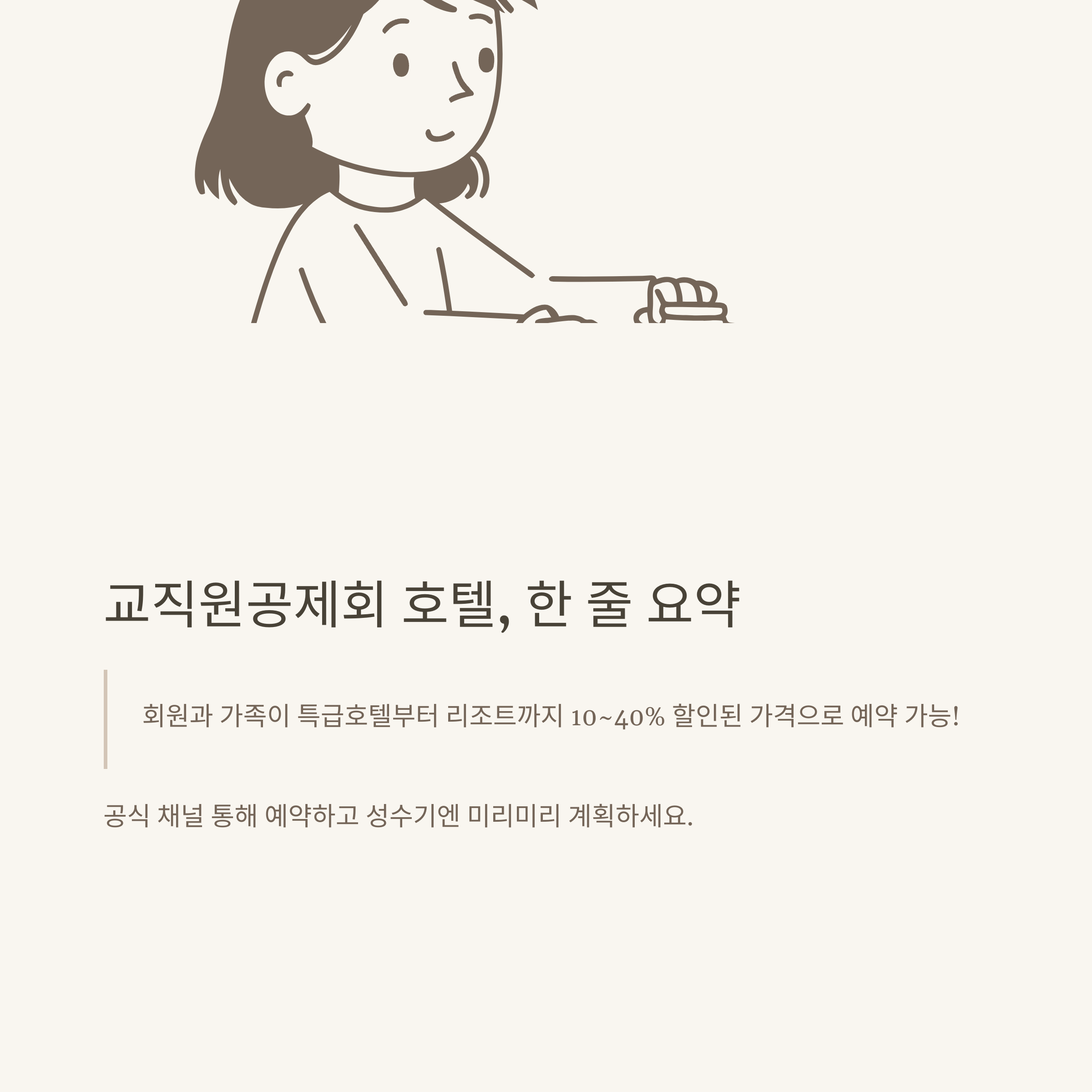 공식 홈페이지( 교직원공제회 호텔 안내 )에서 실제 제휴 호텔 리스트와 할인 내역을 확인할 수 있습니다. 제가 이용했을 때는 비수기와 성수기 모두 혜택이 있어서 정말 만족스러웠어요.
