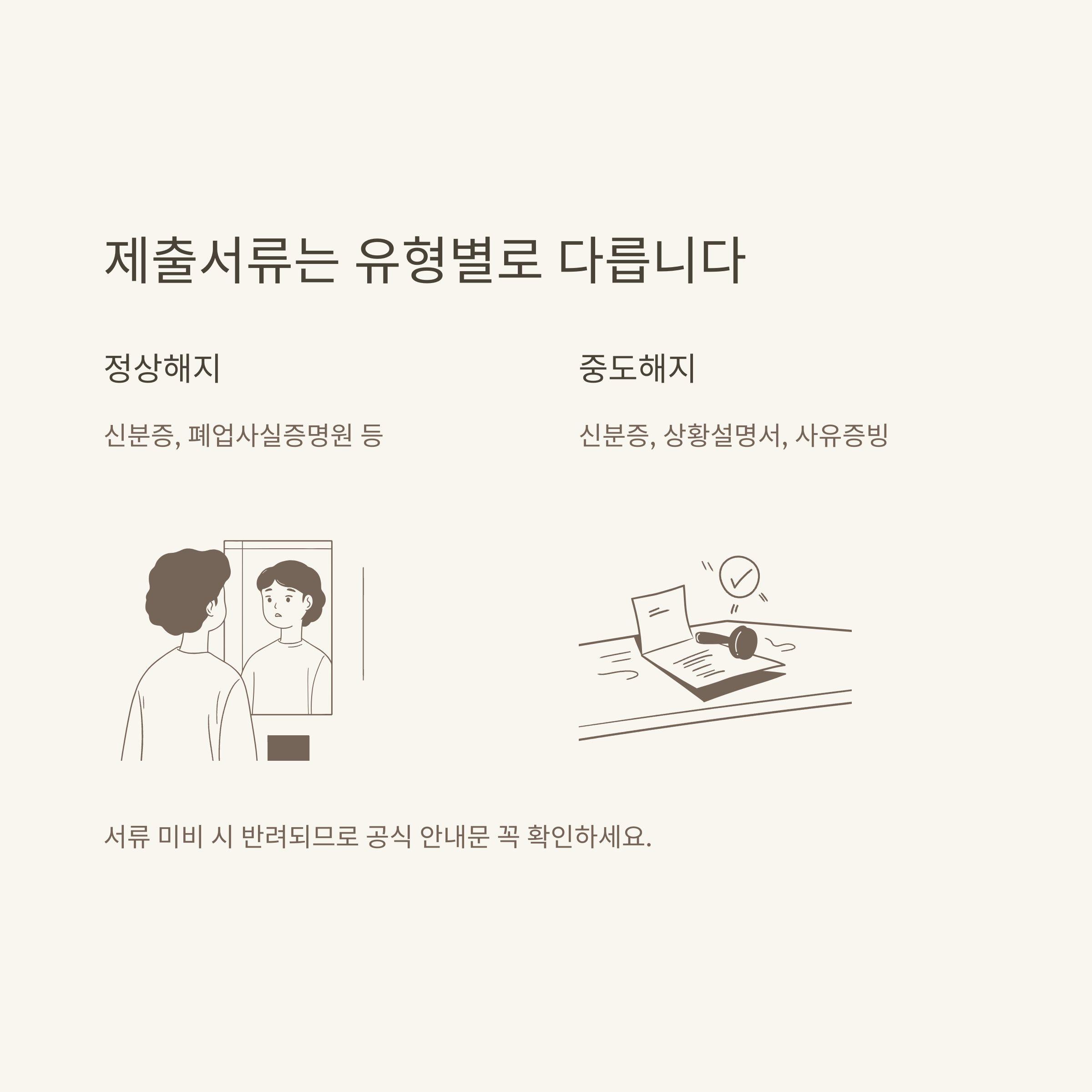 | 정상해지 | 신분증, 폐업사실증명원, 통장사본 등 |