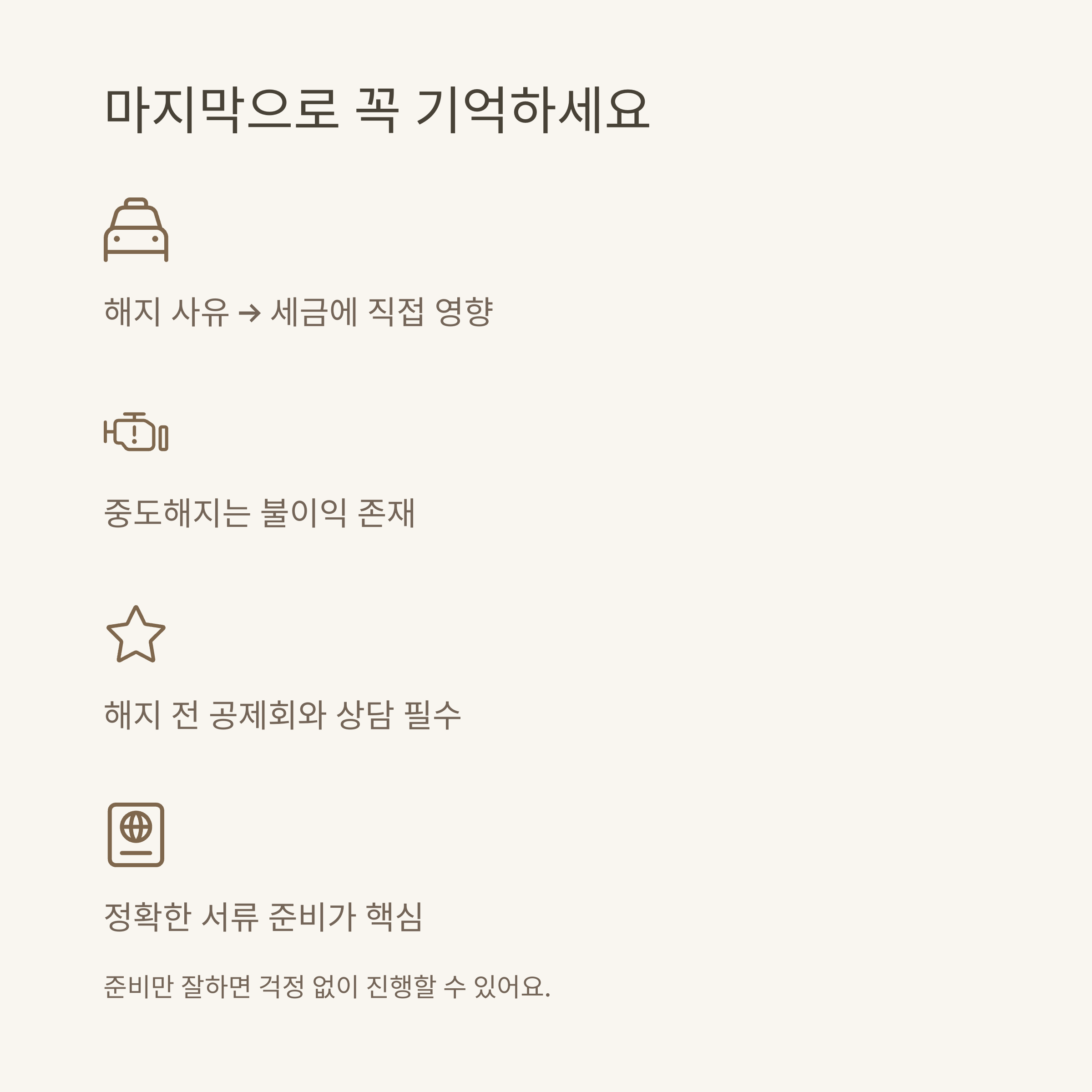 | 유의사항 | 간단한 서류, 혜택 유지 | 불이익(세금, 제한 등) 큼 |