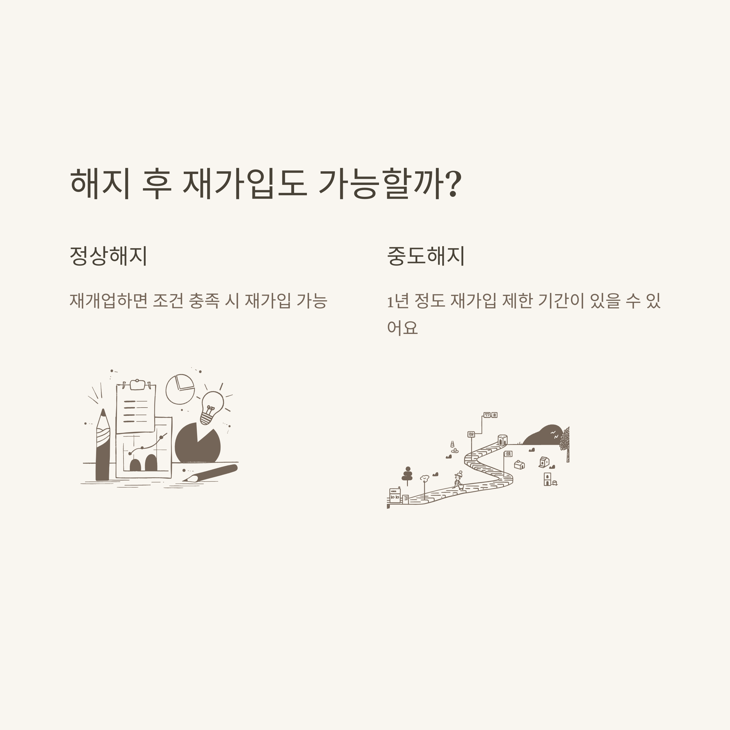 | 재가입 | 재개업 시 즉시 가능 | 제한기간(1년 등) 후 가능 |