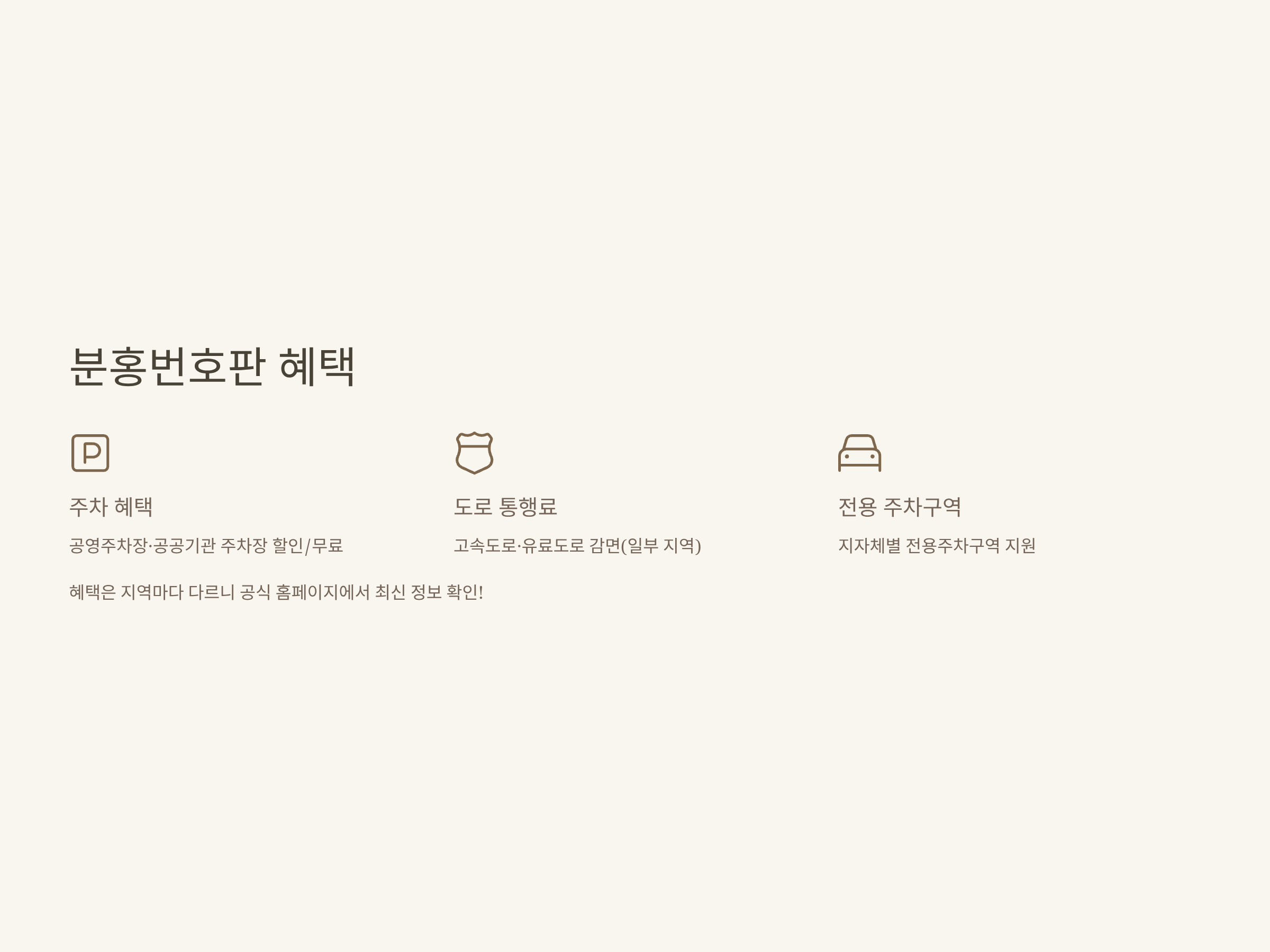| 주요 혜택 | 주차·통행료 감면 등 | 별도 혜택 없음 |
