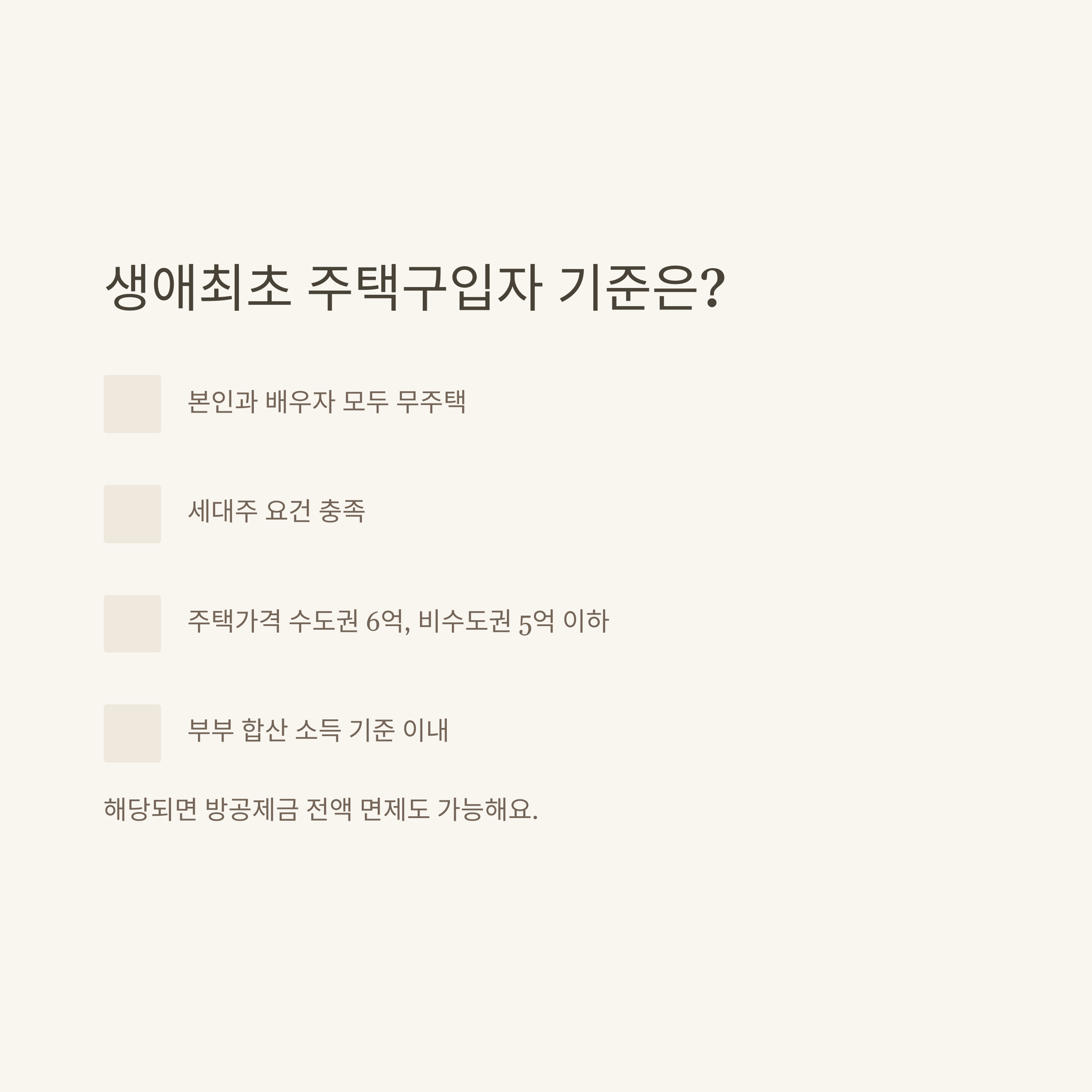 면제 조건은 단순히 ‘무주택자’인 것만으로는 부족할 수 있으니, 소득, 주택가격, 세대주 요건 등 세부 기준까지 꼼꼼히 살펴보세요.