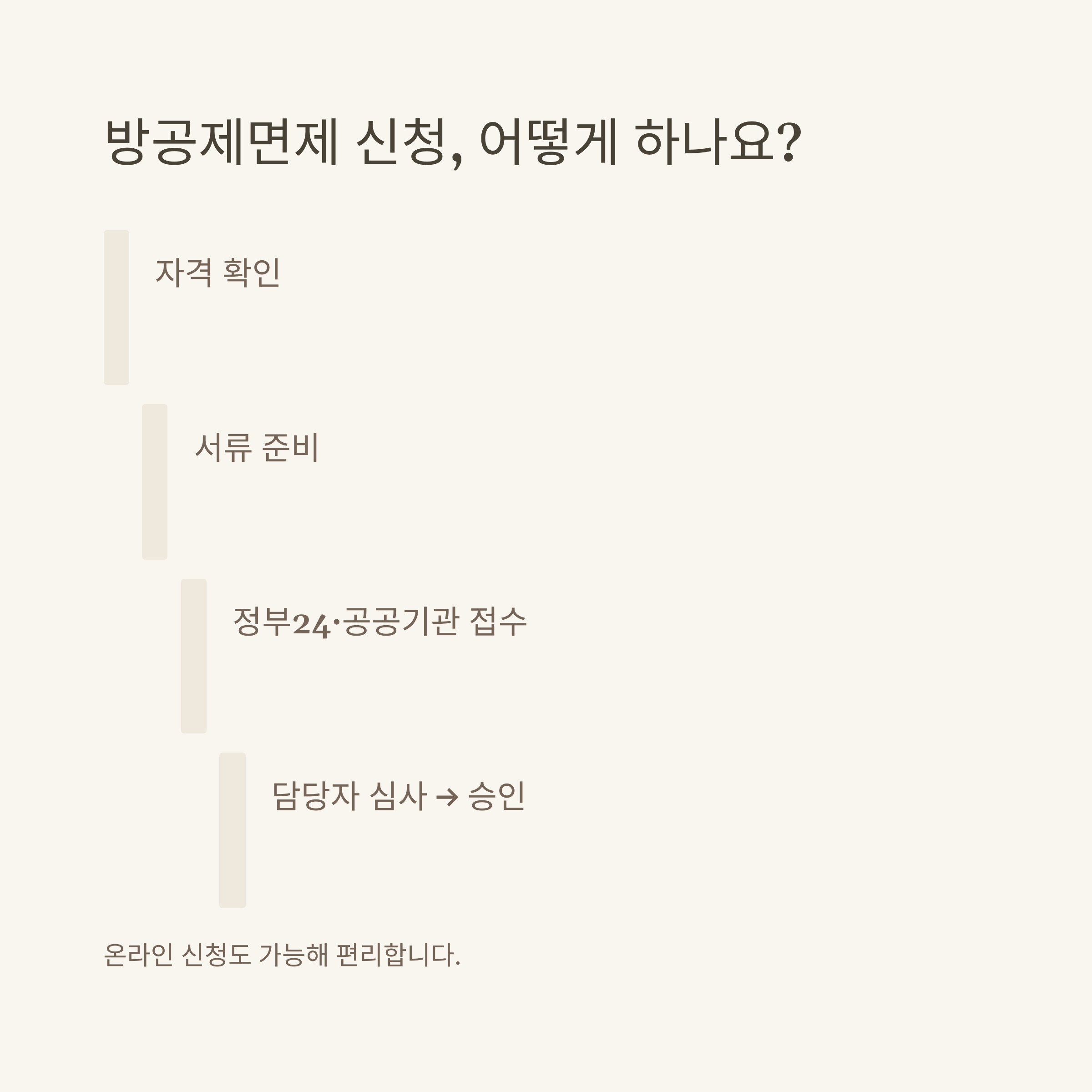 일반적인 절차는 ① 자격 확인 → ② 필요서류 준비 → ③ 온라인(정부24 등) 또는 방문 접수 → ④ 담당자 심사 및 보완 → ⑤ 최종 승인 및 면제 처리 순입니다. 중간에 추가 서류 요청이 있을 수 있으니, 연락처를 정확히 남기고, 안내 문자를 자주 확인하시는 게 좋았습니다.