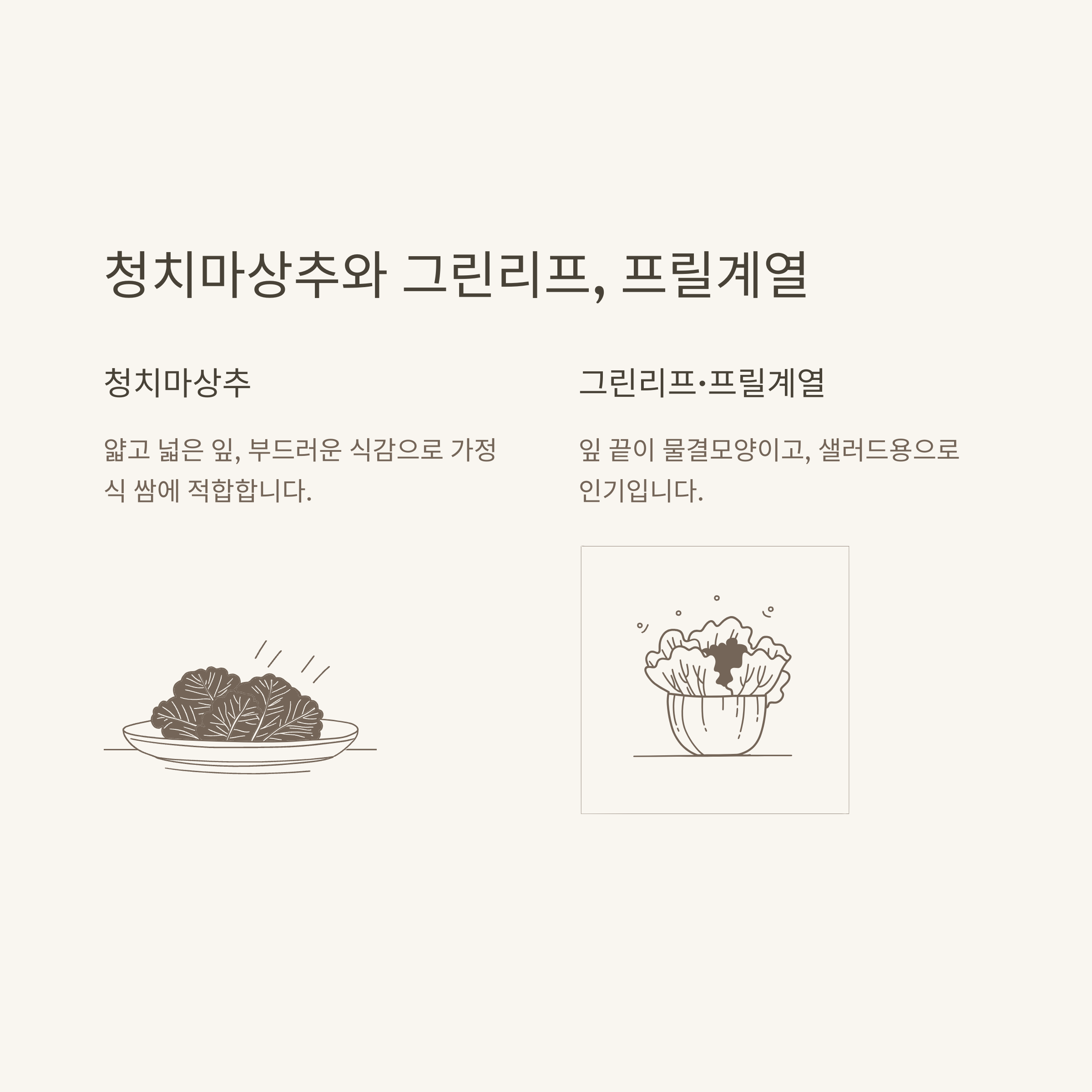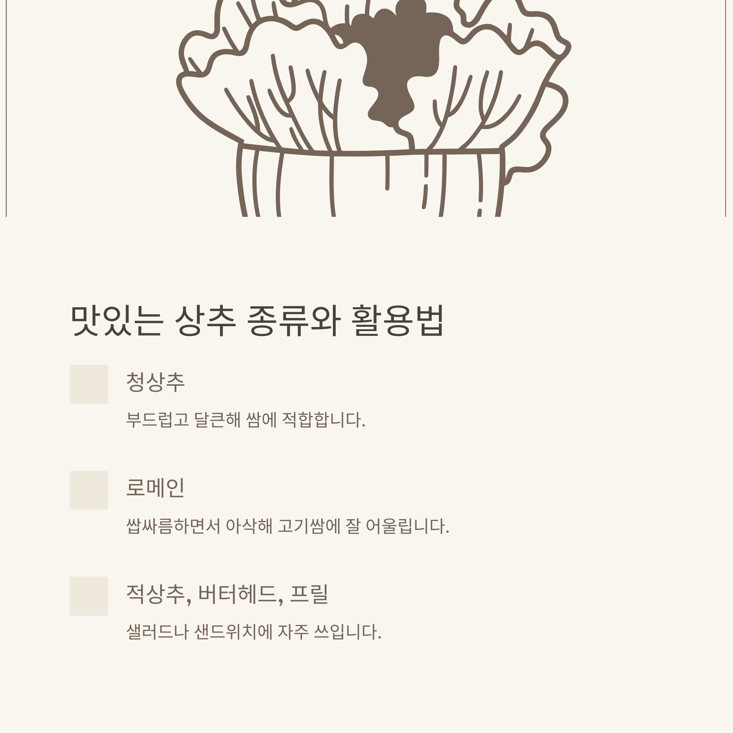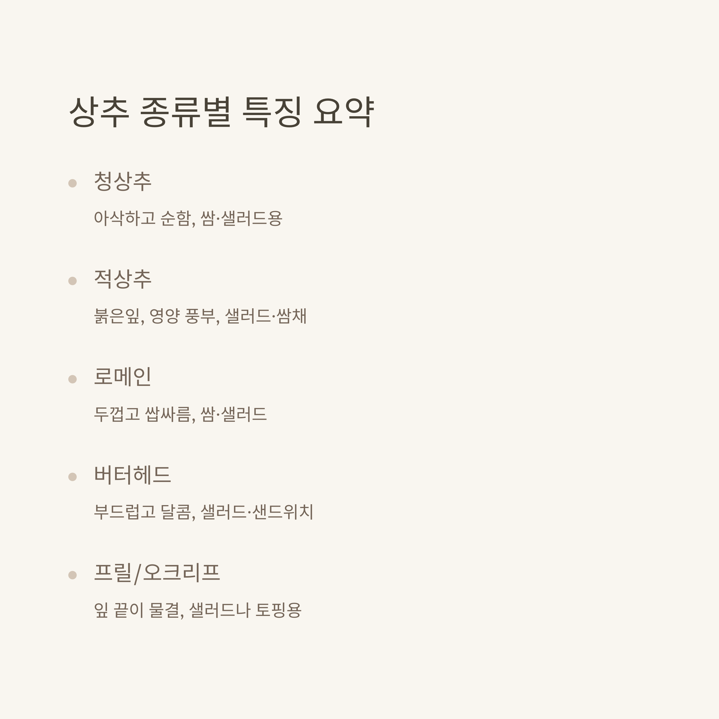 - 청상추: 부드럽고 달큰한 맛, 쌈에 가장 적합