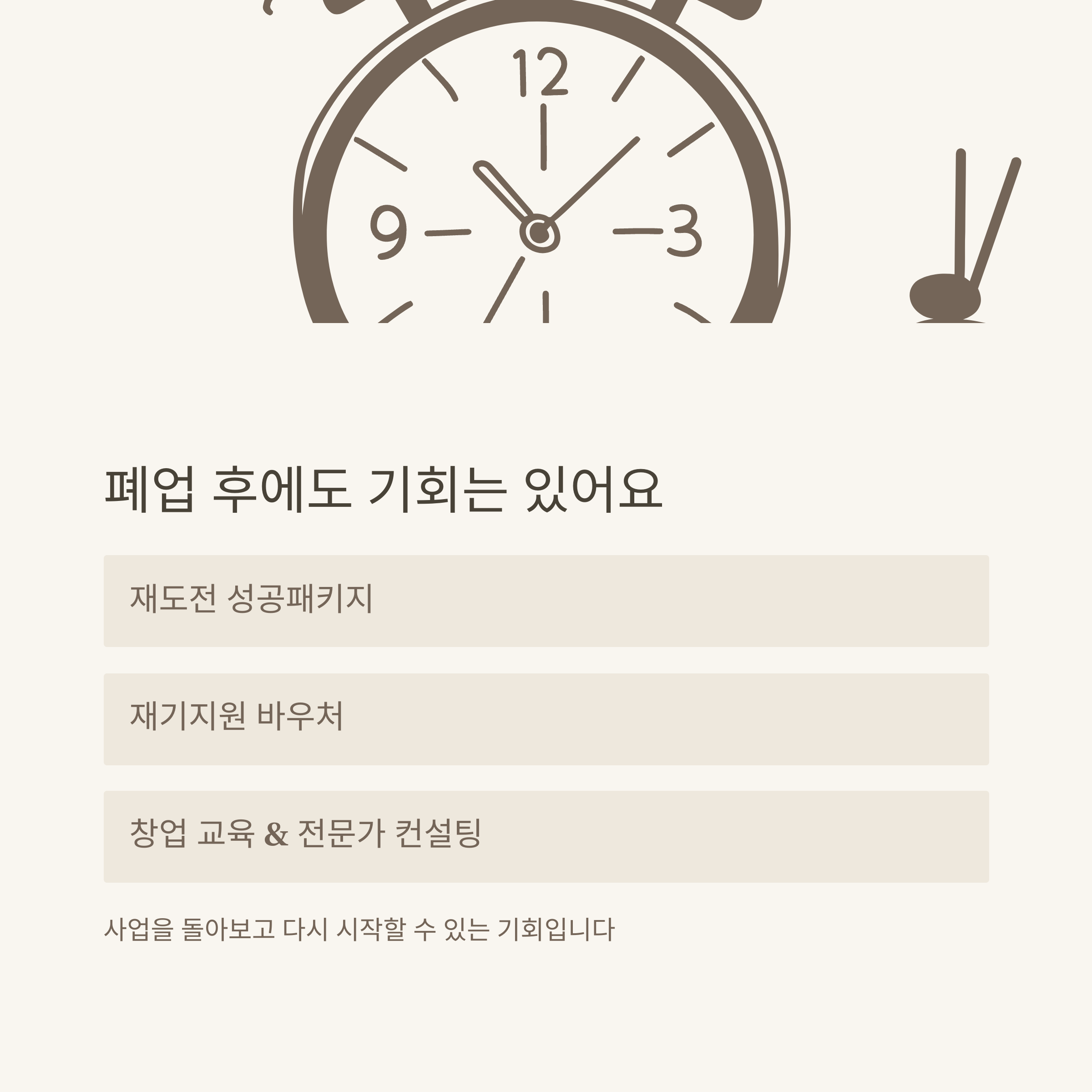 - 재기지원 바우처: 전문가 컨설팅 + 홍보마케팅 비용 지원