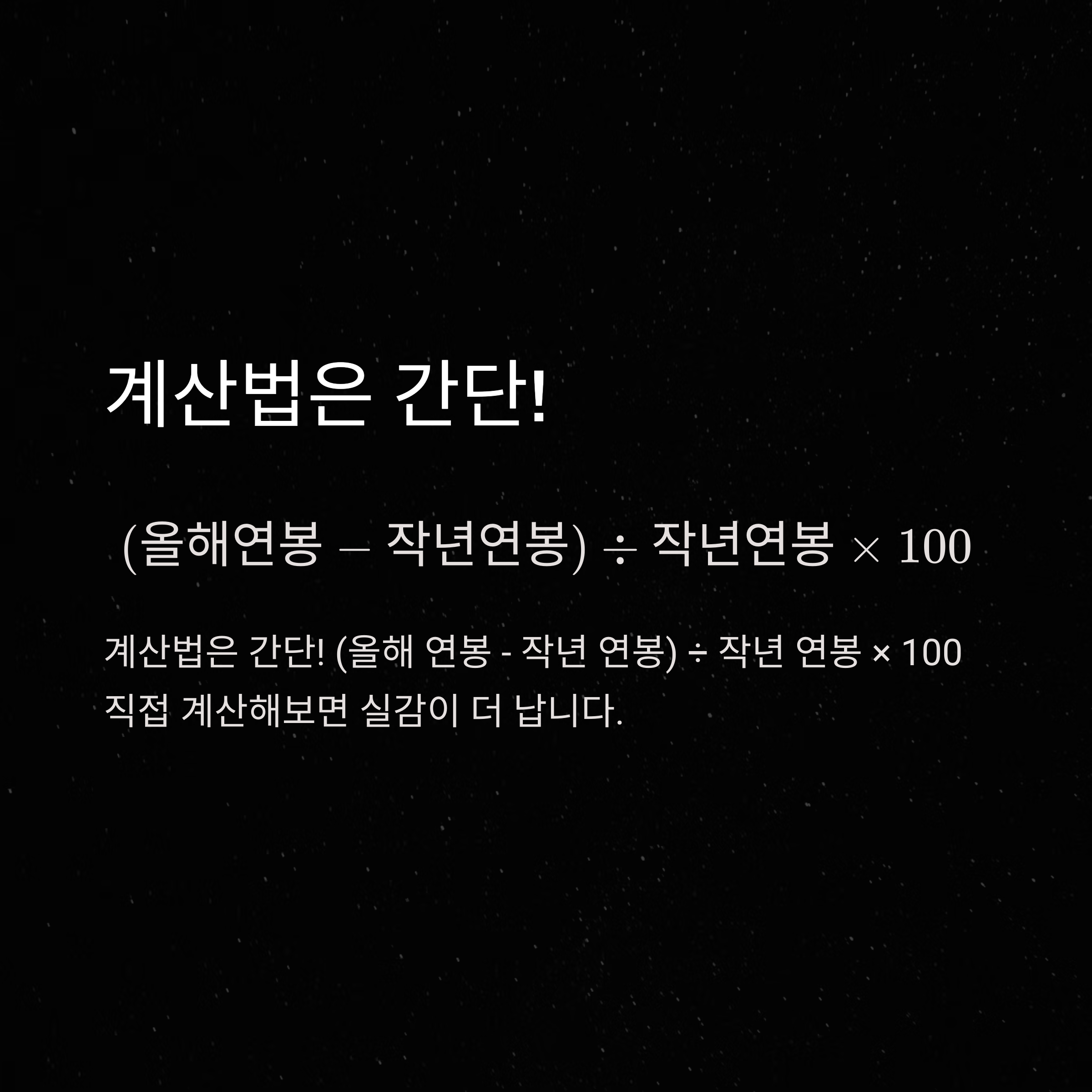 | 인상률 계산 공식 | (올해 연봉 - 작년 연봉) ÷ 작년 연봉 × 100 |
