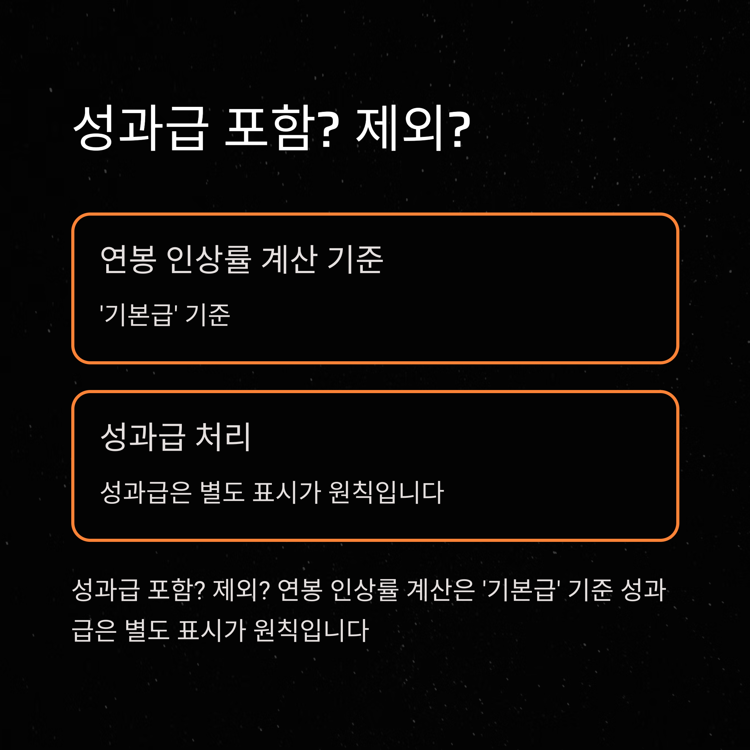 성과급은 기본급 외 일시적 보상으로 보기 때문에, 인상률 계산에는 포함하지 않는 것이 일반적입니다. 연봉은 통상적으로 기본급 또는 고정급 기준으로 산정하는 게 맞습니다.