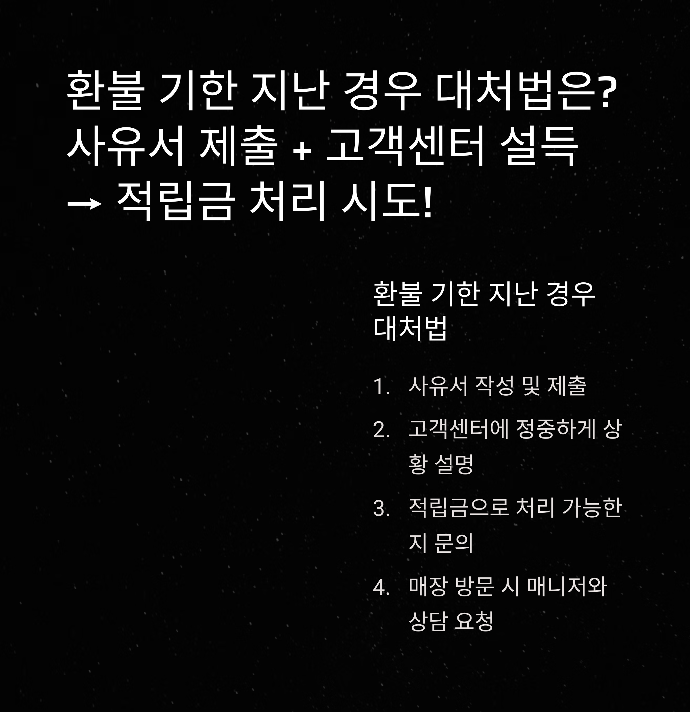 | 30일 이후 처리 | 원칙적 환불 불가, 예외 시 적립금 전환 |