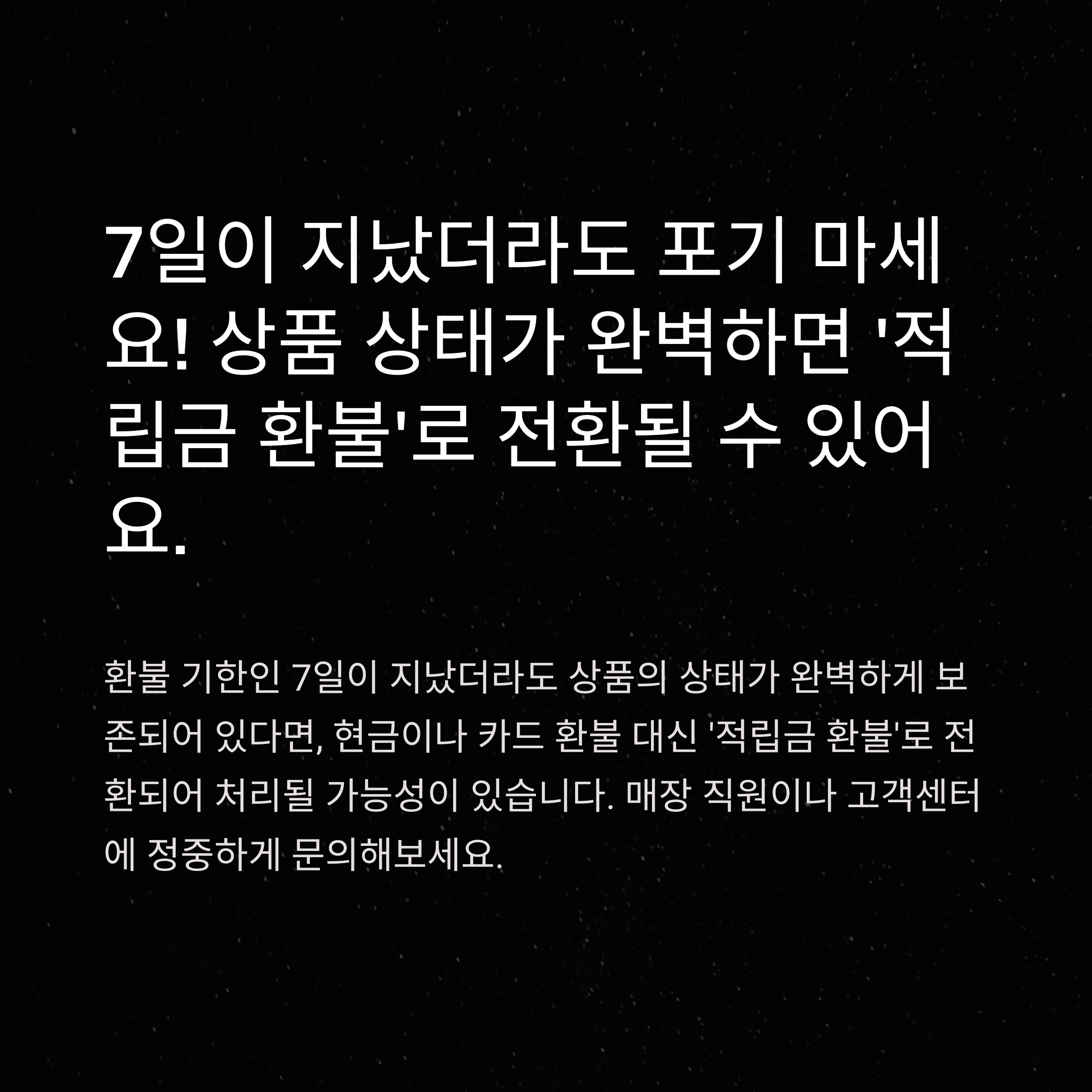 제가 수령일 기준 8일째에 환불을 시도했던 적이 있는데, 유니클로 측에서는 정책상 7일 초과 시 정상 환불은 불가하다고 안내했습니다. 다만, 아래 조건 중 하나라도 해당될 경우, 고객센터에 사유서를 제출하거나 적립금 전환으로 유연하게 처리받을 수 있는 여지가 있었습니다.
