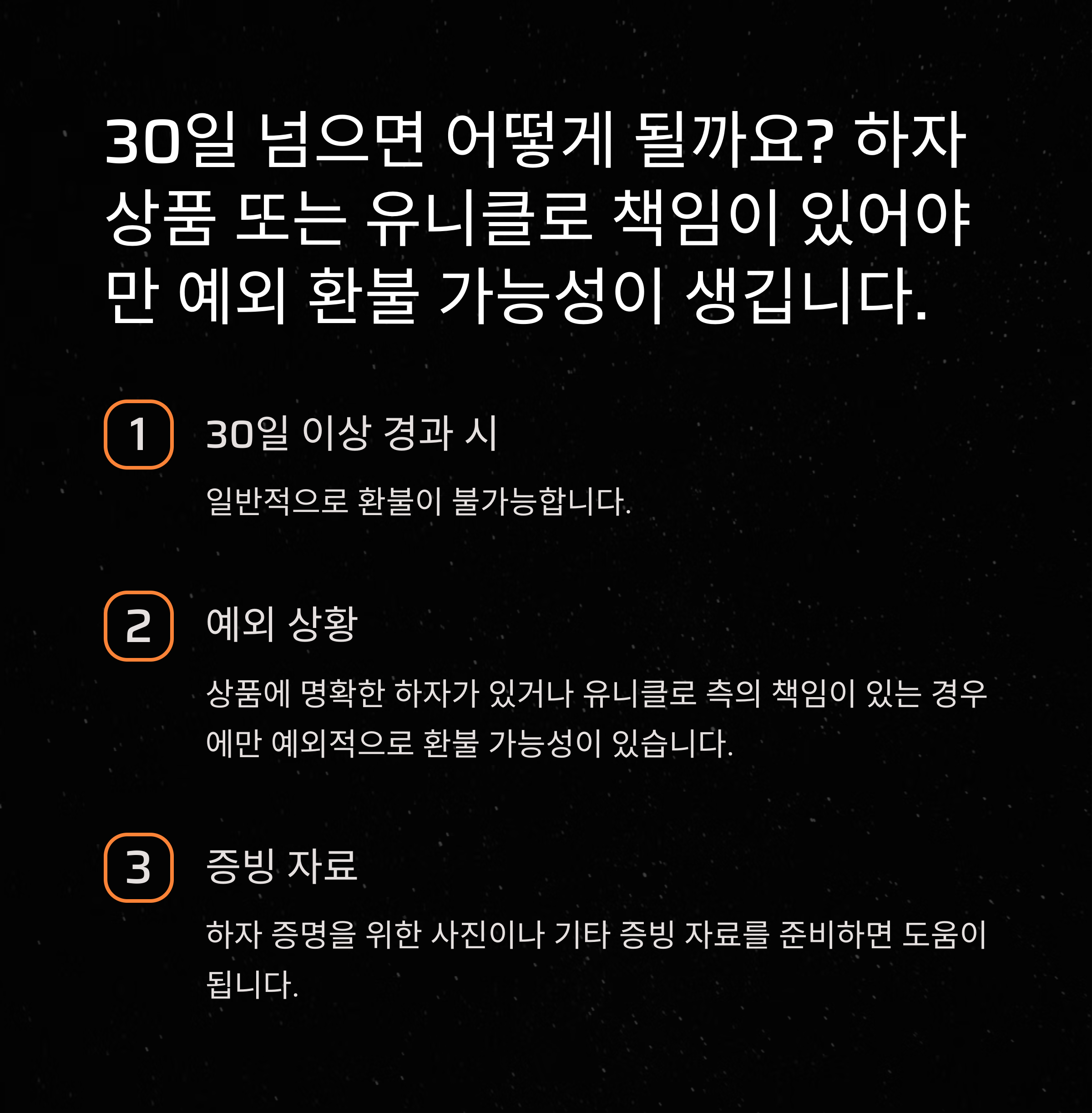 30일이 지난 후 환불 요청은 유니클로 기준으로도 예외 상황을 제외하고는 원칙적으로 불가합니다. 제가 상담을 받아본 결과, 다음 두 조건을 충족해야 일부 예외 처리가 가능했습니다.