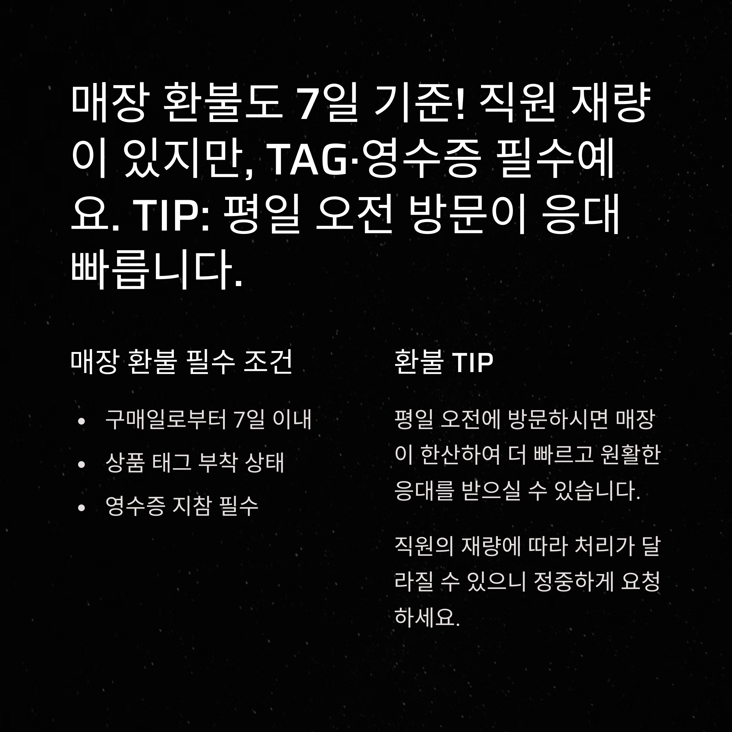 - 매장 환불: 대부분 주말·공휴일 가능 (운영 시간 내)