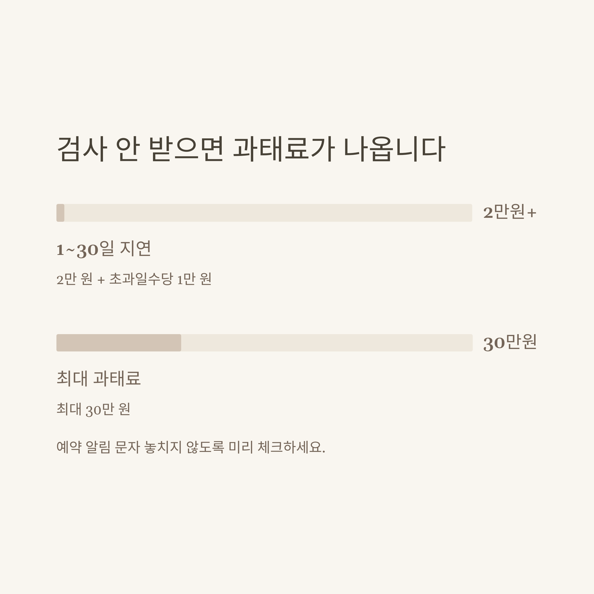 - 정기검사 미이행 시 최초 2만 원, 이후 3일 초과당 1만 원씩 추가